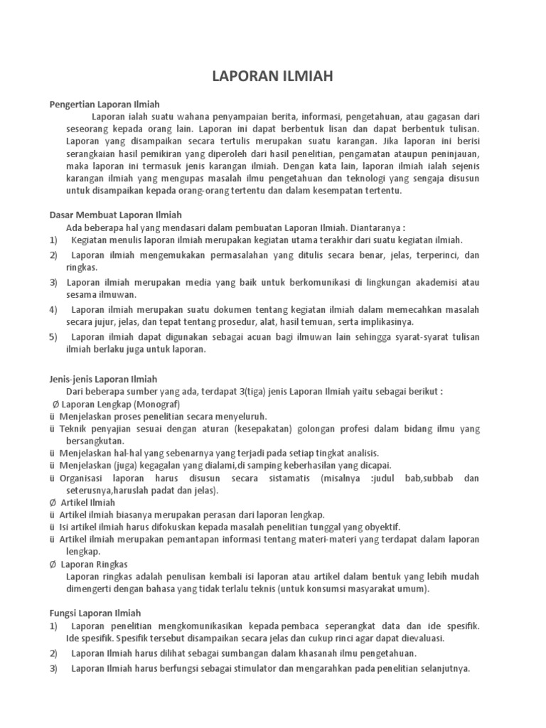 Pengertian Laporan Ilmiah Laporan ialah suatu wahana penyampaian berita, informasi, pengetahuan, atau gagasan dari seseorang kepada orang lain. Laporan ini dapat berbentuk lisan dan dapat berbentuk tulisan. Laporan yang disampaikan secara tertulis merupakan suatu karangan. Jika laporan ini berisi serangkaian hasil pemikiran yang diperoleh dari hasil penelitian, pengamatan ataupun peninjauan, maka laporan ini termasuk jenis karangan ilmiah. Dengan kata lain, laporan ilmiah ialah sejenis karangan ilmiah yang mengupas masalah ilmu pengetahuan dan teknologi yang sengaja disusun untuk disampaikan kepada orang-orang tertentu dan dalam kesempatan tertentu. Dasar Membuat Laporan Ilmiah Ada beberapa hal yang mendasari dalam pembuatan Laporan Ilmiah. Diantaranya : 1) Kegiatan menulis laporan ilmiah merupakan kegiatan utama terakhir dari suatu kegiatan ilmiah. 2) Laporan ilmiah mengemukakan permasalahan yang ditulis secara benar, jelas, terperinci, dan ringkas. 3) Laporan ilmiah merupakan media yang baik untuk berkomunikasi di lingkungan akademisi atau sesama ilmuwan. 4) Laporan ilmiah merupakan suatu dokumen tentang kegiatan ilmiah dalam memecahkan masalah secara jujur, jelas, dan tepat tentang prosedur, alat, hasil temuan, serta implikasinya. 5) Laporan ilmiah dapat digunakan sebagai acuan bagi ilmuwan lain sehingga syarat-syarat tulisan ilmiah berlaku juga untuk laporan. Jenis-jenis Laporan Ilmiah Dari beberapa sumber yang ada, terdapat 3(tiga) jenis Laporan Ilmiah yaitu sebagai berikut : Laporan Lengkap (Monograf) Menjelaskan proses penelitian secara menyeluruh. Teknik penyajian sesuai dengan aturan (kesepakatan) golongan profesi dalam bidang ilmu yang bersangkutan. Menjelaskan hal-hal yang sebenarnya yang terjadi pada setiap tingkat analisis. Menjelaskan (juga) kegagalan yang dialami,di samping keberhasilan yang dicapai. Organisasi laporan harus disusun secara sistamatis (misalnya :judul bab,subbab dan seterusnya,haruslah padat dan jelas). Artikel Ilmiah Artikel ilmiah biasanya merupakan perasan dari laporan lengkap. Isi artikel ilmiah harus difokuskan kepada masalah penelitian tunggal yang obyektif. Artikel ilmiah merupakan pemantapan informasi tentang materi-materi yang terdapat dalam laporan lengkap. Laporan Ringkas Laporan ringkas adalah penulisan kembali isi laporan atau artikel dalam bentuk yang lebih mudah dimengerti dengan bahasa yang tidak terlalu teknis (untuk konsumsi masyarakat umum). Fungsi Laporan Ilmiah 1) Laporan penelitian mengkomunikasikan kepada pembaca seperangkat data dan ide spesifik. Ide spesifik. Spesifik tersebut disampaikan secara jelas dan cukup rinci agar dapat dievaluasi. 2) Laporan Ilmiah harus dilihat sebagai sumbangan dalam khasanah ilmu pengetahuan. 3) Laporan Ilmiah harus berfungsi sebagai stimulator dan mengarahkan pada penelitian selanjutnya.