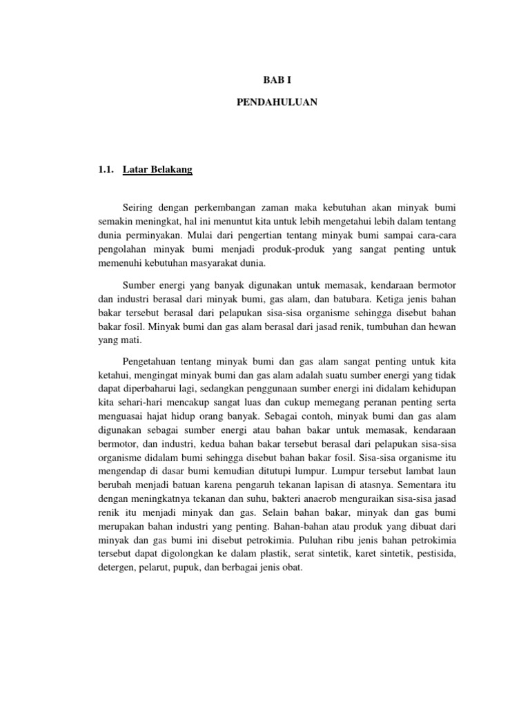 Seiring dengan perkembangan zaman maka kebutuhan akan minyak bumi semakin meningkat, hal ini menuntut kita untuk lebih mengetahui lebih dalam tentang dunia perminyakan. Mulai dari pengertian tentang minyak bumi sampai cara-cara pengolahan minyak bumi menjadi produk-produk yang sangat penting untuk memenuhi kebutuhan masyarakat dunia. Sumber energi yang banyak digunakan untuk memasak, kendaraan bermotor dan industri berasal dari minyak bumi, gas alam, dan batubara. Ketiga jenis bahan bakar tersebut berasal dari pelapukan sisa-sisa organisme sehingga disebut bahan bakar fosil. Minyak bumi dan gas alam berasal dari jasad renik, tumbuhan dan hewan yang mati. Pengetahuan tentang minyak bumi dan gas alam sangat penting untuk kita ketahui, mengingat minyak bumi dan gas alam adalah suatu sumber energi yang tidak dapat diperbaharui lagi, sedangkan penggunaan sumber energi ini didalam kehidupan kita sehari-hari mencakup sangat luas dan cukup memegang peranan penting serta menguasai hajat hidup orang banyak. Sebagai contoh, minyak bumi dan gas alam digunakan sebagai sumber energi atau bahan bakar untuk memasak, kendaraan bermotor, dan industri, kedua bahan bakar tersebut berasal dari pelapukan sisa-sisa organisme didalam bumi sehingga disebut bahan bakar fosil. Sisa-sisa organisme itu mengendap di dasar bumi kemudian ditutupi lumpur. Lumpur tersebut lambat laun berubah menjadi batuan karena pengaruh tekanan lapisan di atasnya. Sementara itu dengan meningkatnya tekanan dan suhu, bakteri anaerob menguraikan sisa-sisa jasad renik itu menjadi minyak dan gas. Selain bahan bakar, minyak dan gas bumi merupakan bahan industri yang penting. Bahan-bahan atau produk yang dibuat dari minyak dan gas bumi ini disebut petrokimia. Puluhan ribu jenis bahan petrokimia tersebut dapat digolongkan ke dalam plastik, serat sintetik, karet sintetik, pestisida, detergen, pelarut, pupuk, dan berbagai jenis obat.