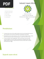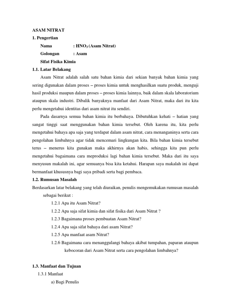 Sifat Fisika Kimia 1.1. Latar Belakang Asam Nitrat adalah salah satu bahan kimia dari sekian banyak bahan kimia yang sering digunakan dalam proses proses kimia untuk menghasilkan suatu produk, menguji hasil produksi maupun dalam proses proses kimia lainnya, baik dalam skala laboratorium ataupun skala industri. Dibalik banyaknya manfaat dari Asam Nitrat, maka dari itu kita perlu mengetahui identitas dari asam nitrat itu sendiri. Pada dasarnya semua bahan kimia itu berbahaya. Dibutuhkan kehati hatian yang sangat tinggi saat menggunakan bahan kimia tersebut. Oleh karena itu, kita perlu mengetahui bahaya apa saja yang terdapat dalam asam nitrat, cara menanganinya serta cara pengolahan limbahnya agar tidak mencemari lingkungan kita. Bila bahan kimia tersebut terus menerus kita gunakan maka akhirnya akan habis, sehingga kita pun perlu mengetahui bagaimana cara meproduksi lagi bahan kimia tersebut. Maka dari itu saya menyusun makalah ini, agar semuanya bisa kita ketahui. Harapan saya makalah ini dapat bermanfaat khususnya bagi saya pribadi serta bagi pembaca. 1.2. Rumusan Masalah Berdasarkan latar belakang yang telah diuraikan, penulis mengemukakan rumusan masalah sebagai berikut : 1.2.1 Apa itu Asam Nitrat? 1.2.2 Apa saja sifat kimia dan sifat fisika dari Asam Nitrat ? 1.2.3 Bagaimana proses pembuatan Asam Nitrat? 1.2.4 Apa saja sifat bahaya dari asam Nitrat? 1.2.5 Apa manfaat asam Nitrat? 1.2.6 Bagaimana cara menanggulangi bahaya akibat tumpahan, paparan ataupun kebocoran dari Asam Nitrat serta cara pengolahan limbahnya?