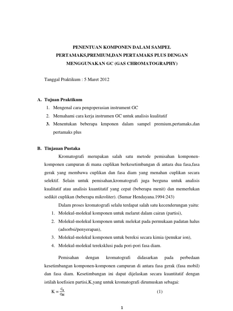 A. Tujuan Praktikum 1. Mengenal cara pengoperasian instrument GC 2. Memahami cara kerja instrumen GC untuk analisis kualitatif 3. Menentukan beberapa kmponen dalam sampel premium,pertamaks,dan pertamaks plus
