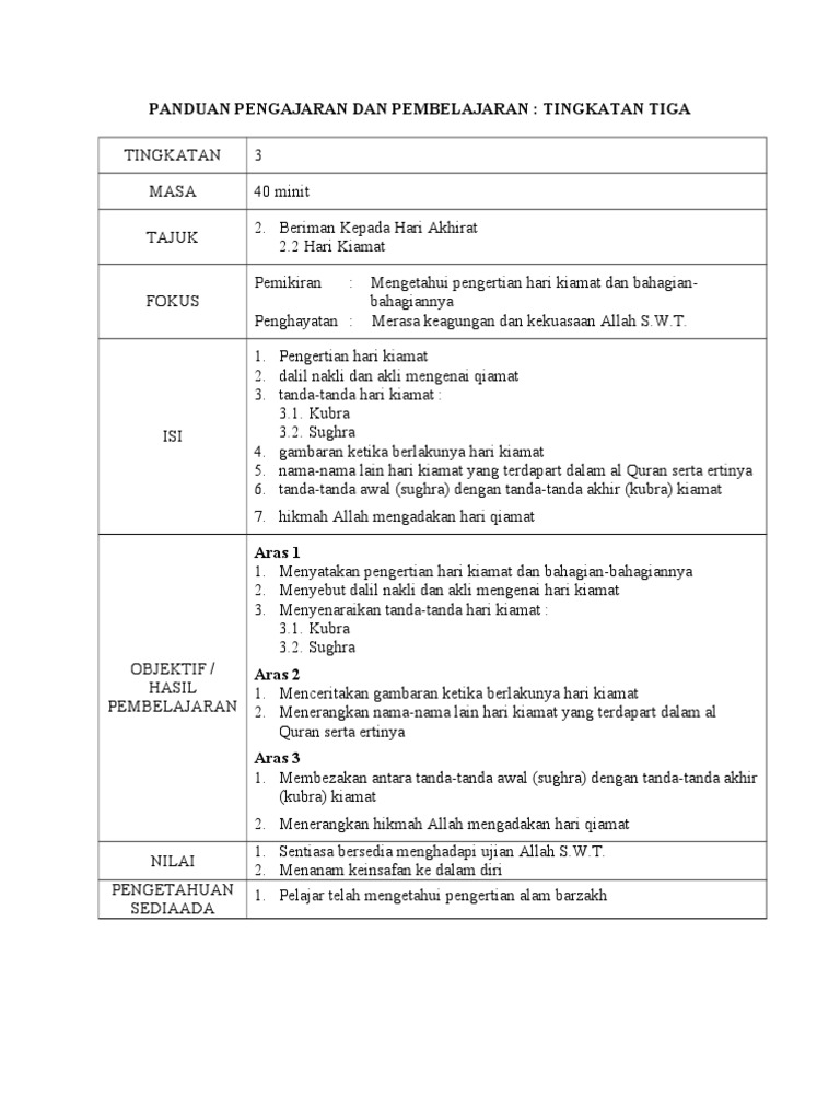PANDUAN PENGAJARAN DAN PEMBELAJARAN : TINGKATAN TIGA TINGKATAN MASA TAJUK 3 40 minit 2. Beriman Kepada Hari Akhirat 2.