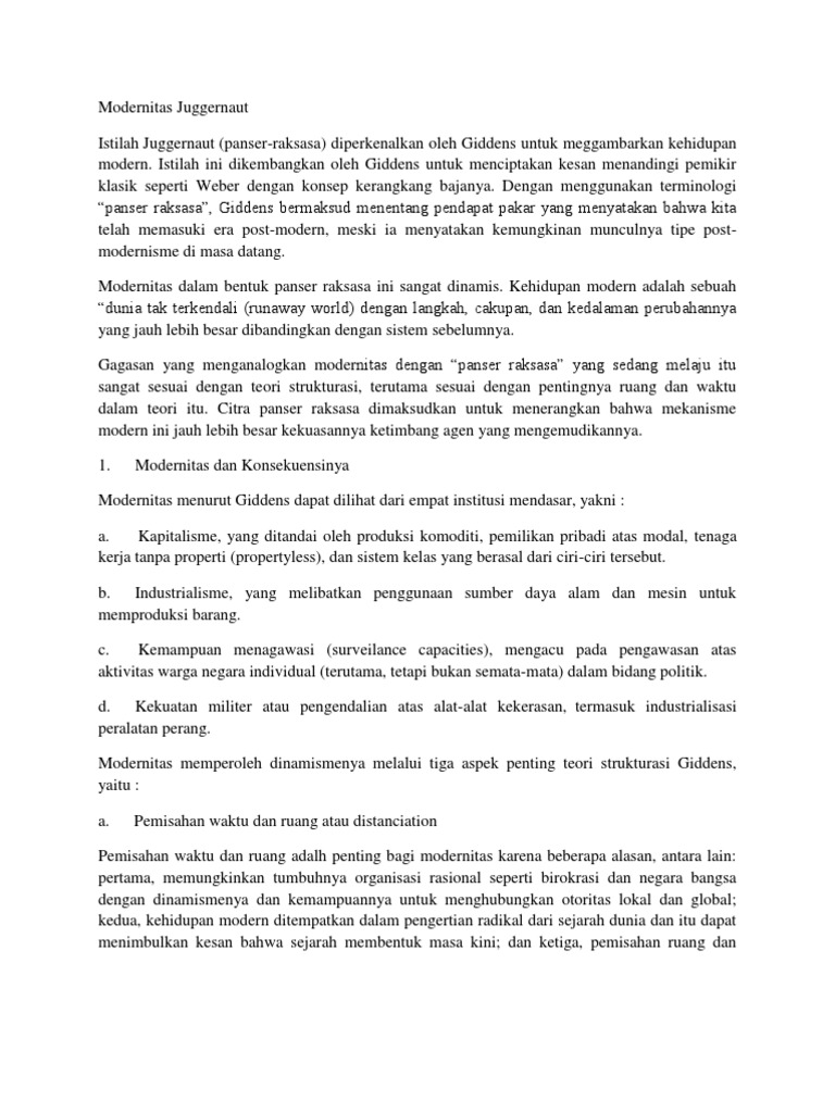 Modernitas Juggernaut Istilah Juggernaut (panser-raksasa) diperkenalkan oleh Giddens untuk meggambarkan kehidupan modern.
