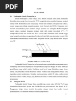 Pastikan air telah mengisi penuh pipa pesat (penstock), bila pipa pesat belum terisi, buka pintu air pipa pesat secara perlahan-lahan. Bila tekanan air telah keluar dari pipa napas, berarti pipa pesat telah terisi penuh air. 2. Pengoperasian Turbin Pastikan inlet valve dalam keadaan tertutup (fully close). Buka inlet valve secara perlahan-lahan, sampai pipa adapter turbin terisi penuh air. Pada saat pembukaan inlet valve akan terdengar aliran air mendesis. Apabila suara aliran air berhenti, berarti air telah mengisi adapter pipe. Buka katup pressure gauge, pastikan jarum menunjuk angka 6 bar (kgf/cm2). Buka guide vane turbin perlahan-lahan sampai putaran turbin generator mencapai tegangan nominal. (prosedur pengoperasian panel kontrol dapat dibaca pada manual operasi ELC). Buka guide vane turbin sampai tegangan balast minimum sebesar 100 120 V. Sambungkan sistem ke jaringan. Perhatikan tegangan ballast, buka kembali guide vane sehingga tegangan ballast cadangan berkisar 60 V. Perhatikan indikator jrum pressure gauge saat melakukan pembukaan guide vane turbin. Apabila jarum guide vane turun dari 6 bar, tutup kembali guide vane secara perlahan, sehingga tekanan pressure tetap 6 bar. 3. Menutup operasi turbin Lakukan urutan penghentian operasi ELC. Setelah seluruh daya dikompensasi ke Ballast, tutup guide vane turbin secara perlahan sehingga sistem akan berhenti. Setelah guide vane turbin tertutup penuh (fully close), tutup inlet valve. Aliran air akan melimpas ke saluran pelimpasan. Atur bukaan pintu air utama bak sehingga air terbagi pada saluran buang atas, untuk mengurangi debit air yang terbuang melalui saluran pelimpas. Distribusi Perencanaan PLTMH Distribusi Sistem transmisi dan distribusi perencanaan PLTMH tidak menggunakan transformer untuk menaikkan dan menurunkan tegangan. Jarak transmisi dan distribusi s.d maksimum 3 km masih memungkinkan tanpa transformer. Losses sepanjang transmisi dan distribusi diasumsikan maksimum 5%. Sistem transmisi menggunakan tegangan 220 V/380 V Untuk mencapai kondisi tersebut, maka digunakan kabel transmisi utama 3 phasa Twisted AI 4 x 70 mm2 . Kabel distribusi digunakan Twisted AI 4 x 35 mm2 , dan kabel koneksi ke konsumen menggunakan Twisted AI 2 x 10 mm2. Setiap sambungan rumah menggunakan pembatas arus 0.5 A untuk membatasi penggunaan beban berlebih. Untuk instalasi rumah digunakan kabel NYM 2 x 1,5 mm2 dan NYM 3 x 1,5 MM2. Setiap intalasi rumah dilengkapi 3 lampu, 1 saklar double, 1 saklar tunggal, dan 1 stop kontak. Rumah Pembangkit Rumah pembangkitan yang merupakan titik pusat pembangkitan direncanakan dengan ukuran 3 x 4 m atau 4 x 4 m tergantung kondisi dilapangan. Pada rumah pembangkit ini akan ditempatkan peralatan elektrilkal - mekanik yang terdiri dari: Turbin dan sistem mekanik