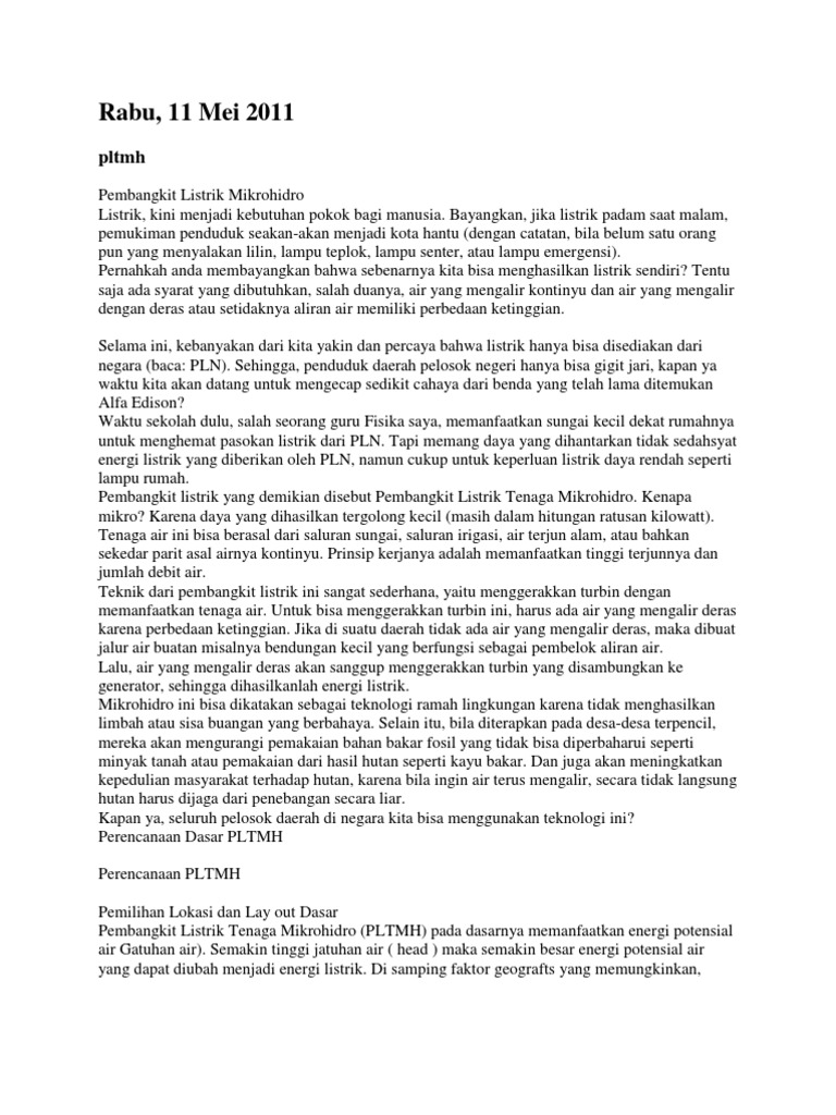 Pembangkit Listrik Mikrohidro Listrik, kini menjadi kebutuhan pokok bagi manusia. Bayangkan, jika listrik padam saat malam, pemukiman penduduk seakan-akan menjadi kota hantu (dengan catatan, bila belum satu orang pun yang menyalakan lilin, lampu teplok, lampu senter, atau lampu emergensi). Pernahkah anda membayangkan bahwa sebenarnya kita bisa menghasilkan listrik sendiri? Tentu saja ada syarat yang dibutuhkan, salah duanya, air yang mengalir kontinyu dan air yang mengalir dengan deras atau setidaknya aliran air memiliki perbedaan ketinggian. Selama ini, kebanyakan dari kita yakin dan percaya bahwa listrik hanya bisa disediakan dari negara (baca: PLN). Sehingga, penduduk daerah pelosok negeri hanya bisa gigit jari, kapan ya waktu kita akan datang untuk mengecap sedikit cahaya dari benda yang telah lama ditemukan Alfa Edison? Waktu sekolah dulu, salah seorang guru Fisika saya, memanfaatkan sungai kecil dekat rumahnya untuk menghemat pasokan listrik dari PLN. Tapi memang daya yang dihantarkan tidak sedahsyat energi listrik yang diberikan oleh PLN, namun cukup untuk keperluan listrik daya rendah seperti lampu rumah. Pembangkit listrik yang demikian disebut Pembangkit Listrik Tenaga Mikrohidro. Kenapa mikro? Karena daya yang dihasilkan tergolong kecil (masih dalam hitungan ratusan kilowatt). Tenaga air ini bisa berasal dari saluran sungai, saluran irigasi, air terjun alam, atau bahkan sekedar parit asal airnya kontinyu. Prinsip kerjanya adalah memanfaatkan tinggi terjunnya dan jumlah debit air. Teknik dari pembangkit listrik ini sangat sederhana, yaitu menggerakkan turbin dengan memanfaatkan tenaga air. Untuk bisa menggerakkan turbin ini, harus ada air yang mengalir deras karena perbedaan ketinggian. Jika di suatu daerah tidak ada air yang mengalir deras, maka dibuat jalur air buatan misalnya bendungan kecil yang berfungsi sebagai pembelok aliran air. Lalu, air yang mengalir deras akan sanggup menggerakkan turbin yang disambungkan ke generator, sehingga dihasilkanlah energi listrik. Mikrohidro ini bisa dikatakan sebagai teknologi ramah lingkungan karena tidak menghasilkan limbah atau sisa buangan yang berbahaya. Selain itu, bila diterapkan pada desa-desa terpencil, mereka akan mengurangi pemakaian bahan bakar fosil yang tidak bisa diperbaharui seperti minyak tanah atau pemakaian dari hasil hutan seperti kayu bakar. Dan juga akan meningkatkan kepedulian masyarakat terhadap hutan, karena bila ingin air terus mengalir, secara tidak langsung hutan harus dijaga dari penebangan secara liar. Kapan ya, seluruh pelosok daerah di negara kita bisa menggunakan teknologi ini? Perencanaan Dasar PLTMH Perencanaan PLTMH Pemilihan Lokasi dan Lay out Dasar Pembangkit Listrik Tenaga Mikrohidro (PLTMH) pada dasarnya memanfaatkan energi potensial air Gatuhan air). Semakin tinggi jatuhan air ( head ) maka semakin besar energi potensial air yang dapat diubah menjadi energi listrik. Di samping faktor geografts yang memungkinkan,