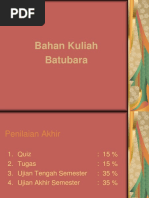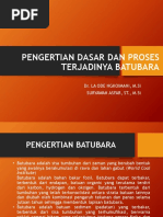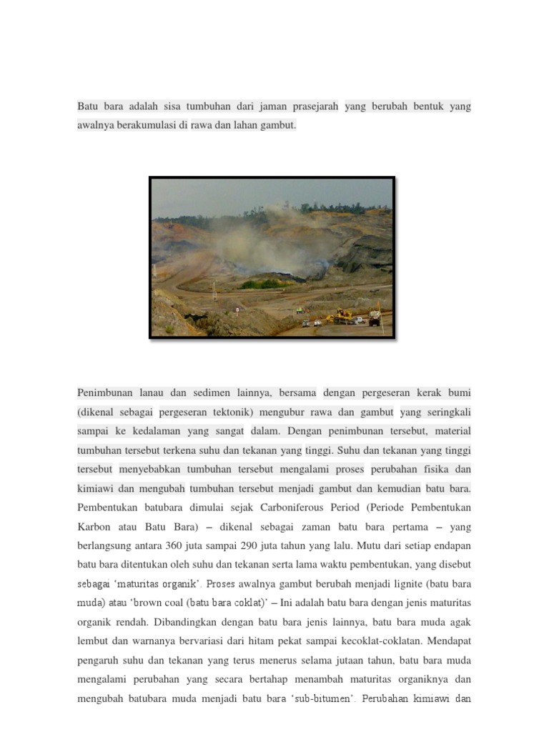 fisika terus berlangsung hingga batu bara menjadi lebih keras dan warnanya lebih hitam dan membentuk bitumen atau antrasit. Dalam kondisi yang tepat, penigkatan maturitas organik yang semakin tinggi terus berlangsung hingga membentuk antrasit. Jenis-jenis Batu Bara Tingkat perubahan yang dialami batu bara, dari gambut sampai menjadi antrasit disebut sebagai pengarangan memiliki hubungan yang penting dan hubungan tersebut disebut sebagai tingkat mutu batu bara. Batu bara dengan mutu yang rendah, seperti batubara muda dan sub-bitumen biasanya lebih lembut dengan materi yang rapuh dan berwarna suram seperti tanah. Baru bara muda memilih tingkat kelembaban yang tinggi dan kandungan karbon yang rendah, dan dengan demikian kandungan energinya rendah. Batu bara dengan mutu yang lebih tinggi umumnya lebih keras dan kuat dan seringkali berwarna hitam cemerlang seperti kaca. Batu bara dengan mutu yang lebih tinggi memiliki kandungan karbon yang lebih banyak, tingkat kelembaban yang lebih rendah dan menghasilkan energi yang lebih banyak. Antrasit adalah batu bara dengan mutu yang paling baik dan dengan demikian memiliki kandungan karbon dan energi yang lebih tinggi serta tingkat kelembaban yang lebih rendah Dari beberapa sumber diatas, dapat dirangkum suatu definisi yaitu: Batubara adalah berupa sedimen organik bahan bakar hidrokarbon padat yang terbentuk dari tumbuh-tumbuhan yang telah mengalami pembusukan secara biokimia, kimia dan fisika dalam kondisi bebas oksigen yang berlangsung pada tekanan serta temperatur tertentu pada kurun waktu yang sangat lama