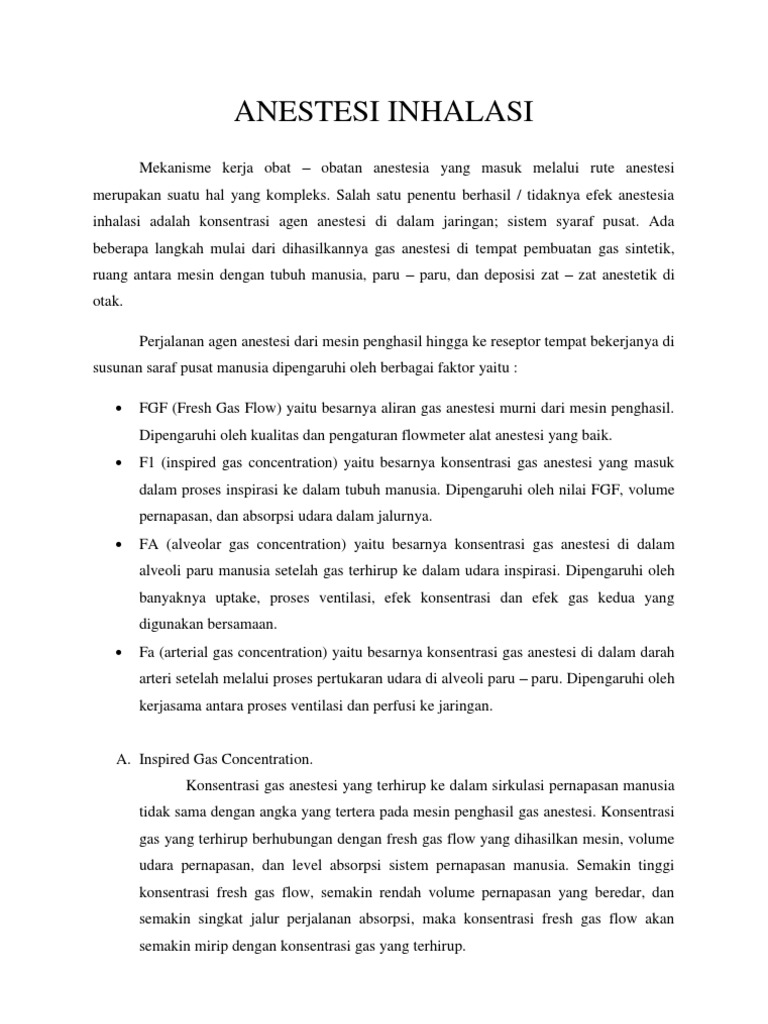 A. Inspired Gas Concentration. Konsentrasi gas anestesi yang terhirup ke dalam sirkulasi pernapasan manusia tidak sama dengan angka yang tertera pada mesin penghasil gas anestesi. Konsentrasi gas yang terhirup berhubungan dengan fresh gas flow yang dihasilkan mesin, volume udara pernapasan, dan level absorpsi sistem pernapasan manusia. Semakin tinggi konsentrasi fresh gas flow, semakin rendah volume pernapasan yang beredar, dan semakin singkat jalur perjalanan absorpsi, maka konsentrasi fresh gas flow akan semakin mirip dengan konsentrasi gas yang terhirup.