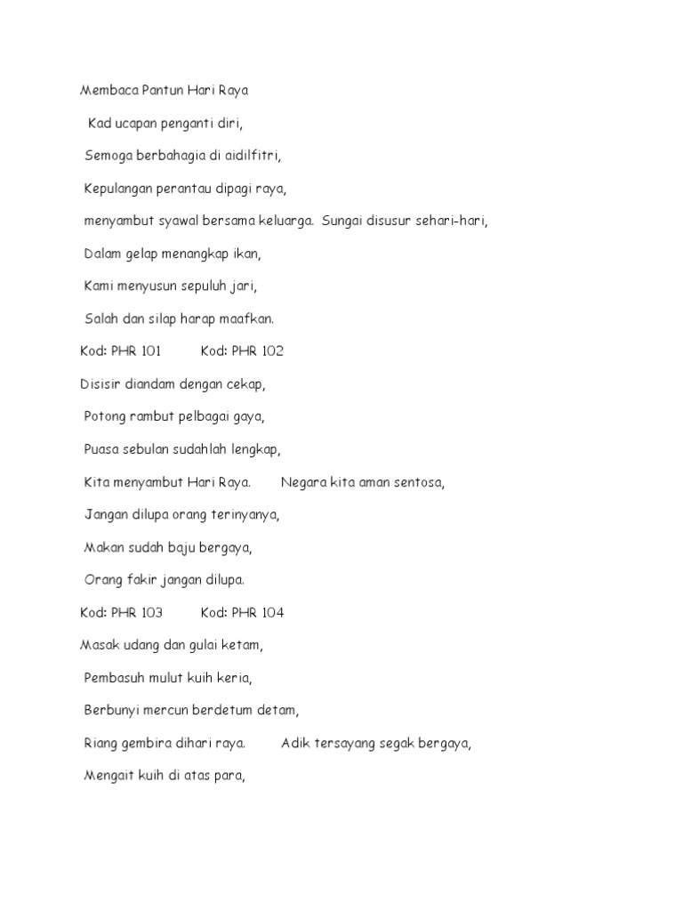 menyambut syawal bersama keluarga. Sungai disusur sehari-hari, Dalam gelap menangkap ikan, Kami menyusun sepuluh jari, Salah dan silap harap maafkan. Kod: PHR 101 Kod: PHR 102
