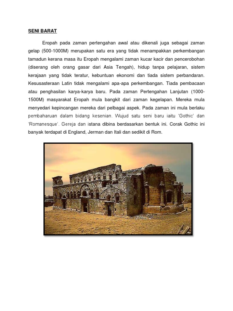 satu era yang tidak menampakkan perkembangan tamadun kerana masa itu Eropah mengalami zaman kucar kacir dan pencerobohan (diserang oleh orang gasar dari Asia Tengah), hidup tanpa pelajaran, sistem kerajaan yang tidak teratur, kebuntuan ekonomi dan tiada sistem perbandaran. Kesusasteraan Latin tidak mengalami apa-apa perkembangan. Tiada pembacaan atau penghasilan karya-karya baru. Pada zaman Pertengahan Lanjutan (10001500M) masyarakat Eropah mula bangkit dari zaman kegelapan. Mereka mula menyedari kepincangan mereka dari pelbagai aspek. Pada zaman ini mula berlaku pembaharuan dalam bidang kesenian. Wujud satu seni baru iaitu Gothic dan Romanesque. Gereja dan istana dibina berdasarkan bentuk ini. Corak Gothic ini banyak terdapat di England, Jerman dan Itali dan sedikit di Rom.