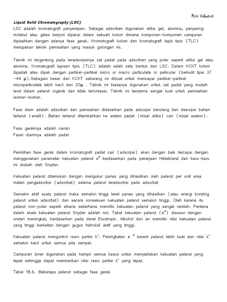 Campuran biner digunakan pada hampir semua kasus untuk menyediakan kekuatan pelarut yang tepat sehingga dapat memberikan nilai rasio partisi k yang tepat. Tabel 18.6. Beberapa pelarut sebagai fase gerak