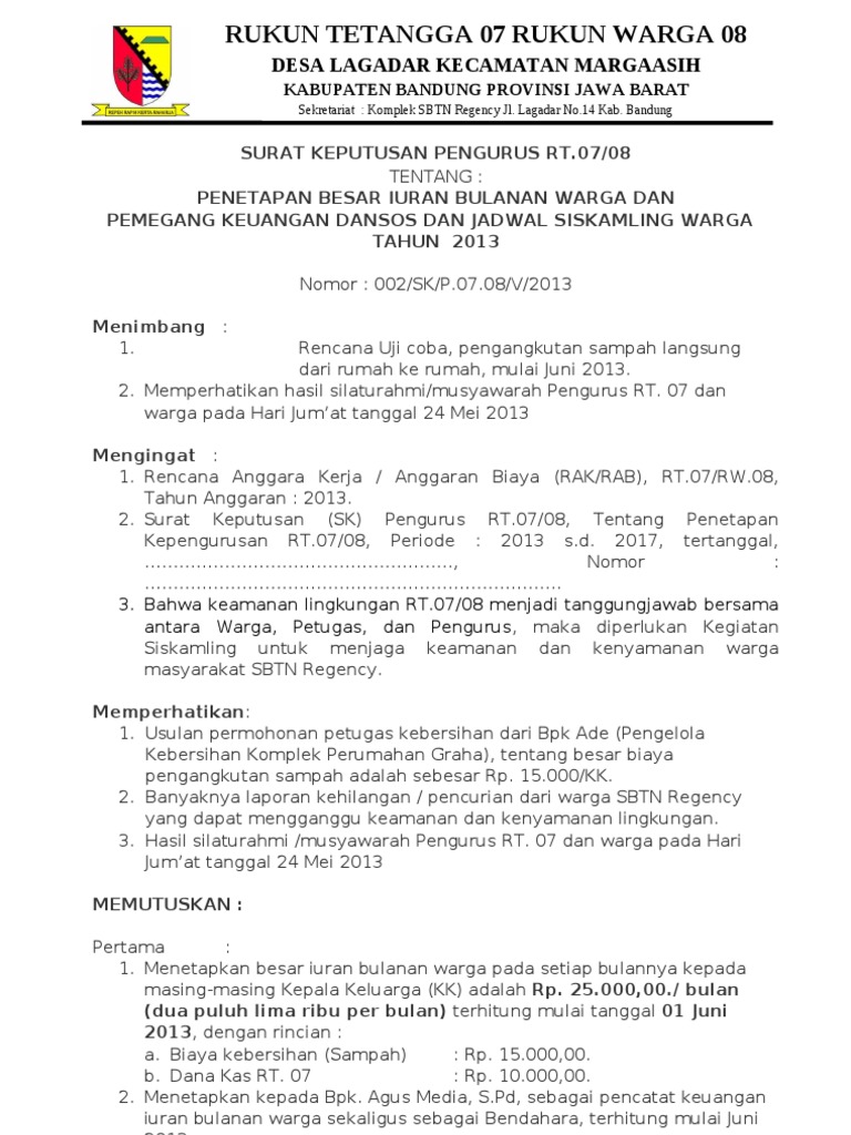 Mengingat : 1. Rencana Anggara Kerja / Anggaran Biaya (RAK/RAB), RT.07/RW.08, Tahun Anggaran : 2013. 2. Surat Keputusan (SK) Pengurus RT.07/08, Tentang Penetapan Kepengurusan RT.07/08, Periode : 2013 s.d. 2017, tertanggal, , Nomor : . 3. Bahwa keamanan lingkungan RT.07/08 menjadi tanggungjawab bersama antara Warga, Petugas, dan Pengurus, maka diperlukan Kegiatan Siskamling untuk menjaga keamanan dan kenyamanan warga masyarakat SBTN Regency. Memperhatikan: 1. Usulan permohonan petugas kebersihan dari Bpk Ade (Pengelola Kebersihan Komplek Perumahan Graha), tentang besar biaya pengangkutan sampah adalah sebesar Rp. 15.000/KK. 2. Banyaknya laporan kehilangan / pencurian dari warga SBTN Regency yang dapat mengganggu keamanan dan kenyamanan lingkungan. 3. Hasil silaturahmi /musyawarah Pengurus RT. 07 dan warga pada Hari Jumat tanggal 24 Mei 2013 MEMUTUSKAN : Pertama : 1. Menetapkan besar iuran bulanan warga pada setiap bulannya kepada masing-masing Kepala Keluarga (KK) adalah Rp. 25.000,00./ bulan (dua puluh lima ribu per bulan) terhitung mulai tanggal 01 Juni 2013, dengan rincian : a. Biaya kebersihan (Sampah) : Rp. 15.000,00. b. Dana Kas RT. 07 : Rp. 10.000,00. 2. Menetapkan kepada Bpk. Agus Media, S.Pd, sebagai pencatat keuangan iuran bulanan warga sekaligus sebagai Bendahara, terhitung mulai Juni 2013.