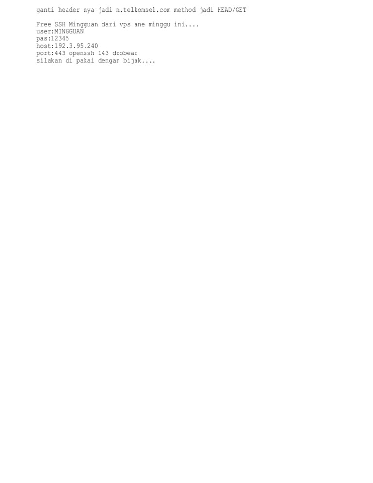 com method jadi HEAD/GET Free SSH Mingguan dari vps ane minggu ini.... user:MINGGUAN pas:12345 host:192.3.95.240 port:443 openssh 143 drobear silakan di pakai dengan bijak....