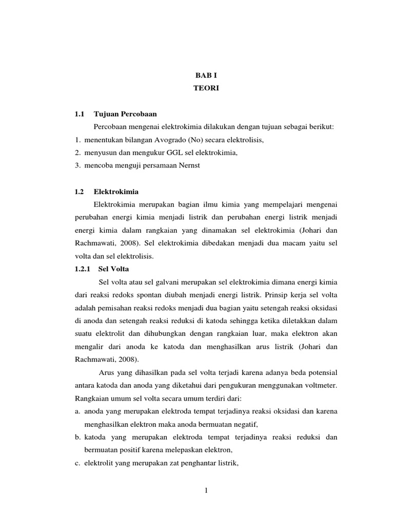 BAB V TUGAS DAN PERTANYAAN .............................................................. 14 5.1 Elektrolisis Untuk Menentukan Bilangan Avogadro .................................. 14 5.2 Mengukur GGL sel dan menguji persamaan Nernst ................................... 14 5.2 Pertanyaan ................................................................................................... 16