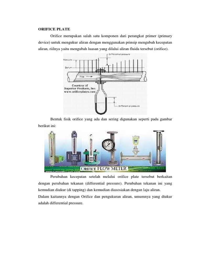 Oriface plate terbuat dari plate tipis stainless steel, pada bagian tengahnya dilubangi dengan ukuran yang telah dihitung besarnya, kemudian dipasang pada pipa alir untuk memberikan beda tekanan. Orifice dapat dipakai untuk semua fluida yang bersih dan gas, tetapi tidak umum dipakai untuk fuida yang mengandung solid/kotoran. Keuntungan dari alat ini adalah mudah diganti, harganya murah, mudah perawatannya tetapi alat ini mempunyai pressure loss yang tingggi. Jenisnya ada tiga macam , seperti terlihat pada Gambar.