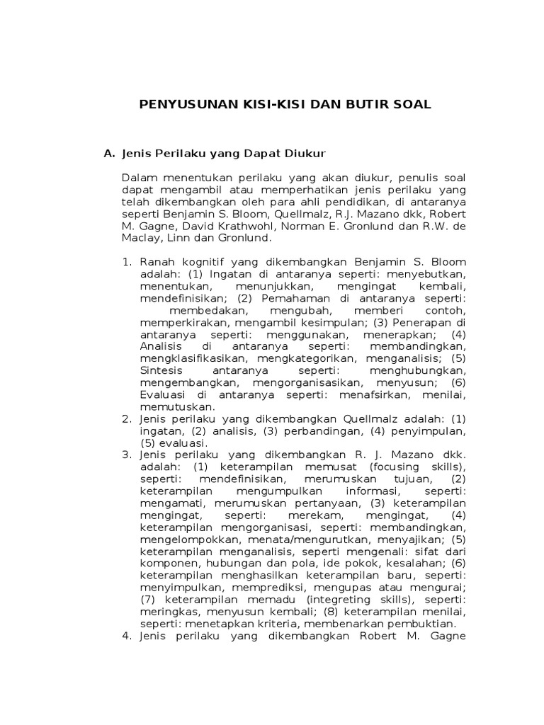 A. Jenis Perilaku yang Dapat Diukur Dalam menentukan perilaku yang akan diukur, penulis soal dapat mengambil atau memperhatikan jenis perilaku yang telah dikembangkan oleh para ahli pendidikan, di antaranya seperti Benjamin S. Bloom, Quellmalz, R.J. Mazano dkk, Robert M. Gagne, David Krathwohl, Norman E. Gronlund dan R.W. de Maclay, Linn dan Gronlund. 1. Ranah kognitif yang dikembangkan Benjamin S. Bloom adalah: (1) Ingatan di antaranya seperti: menyebutkan, menentukan, menunjukkan, mengingat kembali, mendefinisikan; (2) Pemahaman di antaranya seperti: membedakan, mengubah, memberi contoh, memperkirakan, mengambil kesimpulan; (3) Penerapan di antaranya seperti: menggunakan, menerapkan; (4) Analisis di antaranya seperti: membandingkan, mengklasifikasikan, mengkategorikan, menganalisis; (5) Sintesis antaranya seperti: menghubungkan, mengembangkan, mengorganisasikan, menyusun; (6) Evaluasi di antaranya seperti: menafsirkan, menilai, memutuskan. 2. Jenis perilaku yang dikembangkan Quellmalz adalah: (1) ingatan, (2) analisis, (3) perbandingan, (4) penyimpulan, (5) evaluasi. 3. Jenis perilaku yang dikembangkan R. J. Mazano dkk. adalah: (1) keterampilan memusat (focusing skills), seperti: mendefinisikan, merumuskan tujuan, (2) keterampilan mengumpulkan informasi, seperti: mengamati, merumuskan pertanyaan, (3) keterampilan mengingat, seperti: merekam, mengingat, (4) keterampilan mengorganisasi, seperti: membandingkan, mengelompokkan, menata/mengurutkan, menyajikan; (5) keterampilan menganalisis, seperti mengenali: sifat dari komponen, hubungan dan pola, ide pokok, kesalahan; (6) keterampilan menghasilkan keterampilan baru, seperti: menyimpulkan, memprediksi, mengupas atau mengurai; (7) keterampilan memadu (integreting skills), seperti: meringkas, menyusun kembali; (8) keterampilan menilai, seperti: menetapkan kriteria, membenarkan pembuktian. 4. Jenis perilaku yang dikembangkan Robert M. Gagne