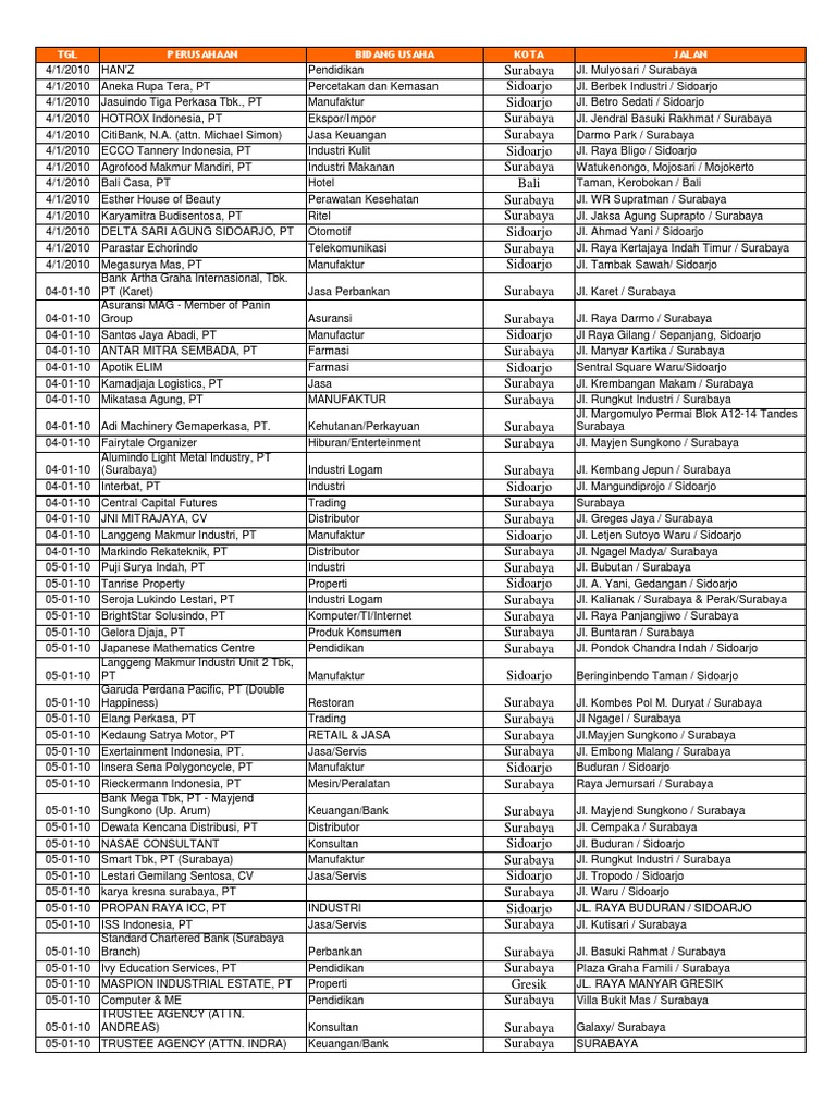 25-03-10 ELTIM Overseas Education Consultants Pendidikan 26-03-10 Trisula Mas Sakti, PT 26-03-10 BNL PATENT PT 26-03-10 Bank BRI 26-03-10 Niko Tehnik Utama, PT 26-03-10 First State Futures, PT (Att. Lusida) 27-03-10 PG -TK-SD Santa Lorent 29-03-10 Erha Clinic Indonesia, PT 29-03-10 Hisamitsu Pharma Indonesia, PT 29-03-10 Asuransi Raksa Pratikara, PT 29-03-10 Sarana Teknik Wiratama, PT Citraagung Tirta Jatim, PT (member of 29-03-10 Sinarmas Group) 29-03-10 Surabaya Shopping Media 29-03-10 Mitra Binamandiri Makmur, PT 30-03-10 Shafira Laras Persada, PT 30-03-10 Yayasan Pendidikan Kristen Gloria 30-03-10 Halim Sarana Cahaya Semesta, PT BSW Gramedia Jakarta (Gramedia 30-03-10 Group) 30-03-10 Candi 2000 Realtindo, PT 31-03-10 Bancar Makmur Indah, PT Wahana Ottomitra Multiartha Tbk., PT 31-03-10 (WOM Finance) - Kertajaya 31-03-10 A.J. Sequislife, PT (att. Sherly) 31-03-10 Rodamas, PT (Jakarta) 31-03-10 Ferrostaal Equipment Solutions, PT 01-04-10 Drs. Bani Utomo Santoso 03-04-10 SUPREME CONSULTING GROUP 03-04-10 Apotek Dukuh Kupang 03-04-10 CITRA NUTRINDO LANGGENG, PT. 03-04-10 BABA PRIMA MANUFACTURING, PT 05-04-10 Mitra Usaha Pandu Artha, PT 05-04-10 Multi Rubindo, PT 05-04-10 Aneka Prima PT 05-04-10 SNS GROUP 05-04-10 Citra Harapan Semesta, PT 06-04-10 Metrodata Electronics, Tbk., PT 07-04-10 Indomarco Prismatama, PT 07-04-10 ART, PT 07-04-10 H2O Motion Supra Usadhatama, PT ( The Tempo 07-04-10 Group) Astra Internasional Tbk, PT - Honda 07-04-10 (Mataram) 08-04-10 Unggul Sinar Perkasa, PT 08-04-10 AKAR DAYA MANDIRI, CV 08-04-10 Jawa Betonindo Perkasa, PT INDUSTRI trading,importir,distributor Manufaktur Distributor Distributor Industri Sepatu Komputer/TI/Internet Media Percetakan dan Kemasan Pendidikan Importer Komputer/TI/Internet Properti Ekspor/Impor Keuangan/Bank Asuransi Jasa Distributor Percetakan dan Kemasan Jasa Konsultan Farmasi Ekspor/Impor Keuangan/Bank Pendidikan Perawatan Kesehatan Farmasi Keuangan/Bank Elektronika/Semikonduktor Properti Polimer/Plastik/Karet Jasa Konsultan Perbankan