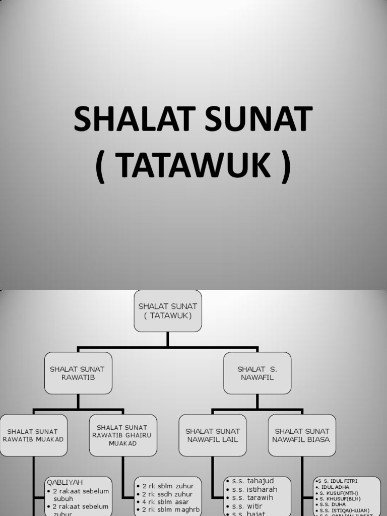 pelaksanaannya 2 rakaat sb/ssd zhuhur 2 rakaat sb subuh 2 rakaat ssd maghrib 2 rakaat isya. . 2. Ghairu Muakkad :yang kurang ditekankan pelaksnaannya - 2 rakaat sb/ 2/4 rakaat ssd zhuhur - 4 rakaat sb asar - 2 rakaat sb isya