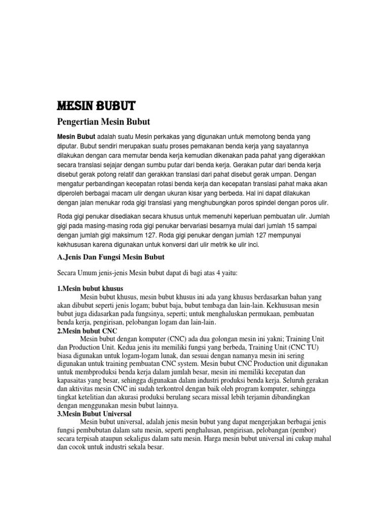 Mesin Bubut adalah suatu Mesin perkakas yang digunakan untuk memotong benda yang diputar. Bubut sendiri merupakan suatu proses pemakanan benda kerja yang sayatannya dilakukan dengan cara memutar benda kerja kemudian dikenakan pada pahat yang digerakkan secara translasi sejajar dengan sumbu putar dari benda kerja. Gerakan putar dari benda kerja disebut gerak potong relatif dan gerakkan translasi dari pahat disebut gerak umpan. Dengan mengatur perbandingan kecepatan rotasi benda kerja dan kecepatan translasi pahat maka akan diperoleh berbagai macam ulir dengan ukuran kisar yang berbeda. Hal ini dapat dilakukan dengan jalan menukar roda gigi translasi yang menghubungkan poros spindel dengan poros ulir. Roda gigi penukar disediakan secara khusus untuk memenuhi keperluan pembuatan ulir. Jumlah gigi pada masing-masing roda gigi penukar bervariasi besarnya mulai dari jumlah 15 sampai dengan jumlah gigi maksimum 127. Roda gigi penukar dengan jumlah 127 mempunyai kekhususan karena digunakan untuk konversi dari ulir metrik ke ulir inci.