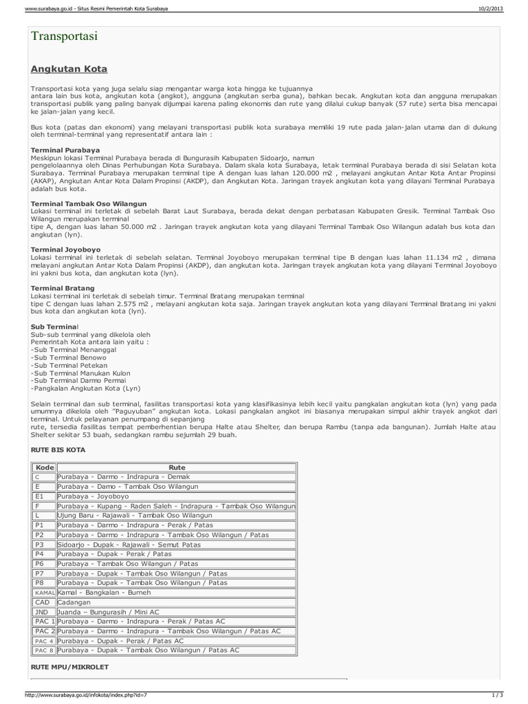 Transportasi kota yang juga selalu siap mengantar warga kota hingga ke tujuannya antara lain bus kota, angkutan kota (angkot), angguna (angkutan serba guna), bahkan becak. Angkutan kota dan angguna merupakan transportasi publik yang paling banyak dijumpai karena paling ekonomis dan rute yang dilalui cukup banyak (57 rute) serta bisa mencapai ke jalan-jalan yang kecil. Bus kota (patas dan ekonomi) yang melayani transportasi publik kota surabaya memiliki 19 rute pada jalan-jalan utama dan di dukung oleh terminal-terminal yang representatif antara lain : Terminal Purabaya Meskipun lokasi Terminal Purabaya berada di Bungurasih Kabupaten Sidoarjo, namun pengelolaannya oleh Dinas Perhubungan Kota Surabaya. Dalam skala kota Surabaya, letak terminal Purabaya berada di sisi Selatan kota Surabaya. Terminal Purabaya merupakan terminal tipe A dengan luas lahan 120.000 m2 , melayani angkutan Antar Kota Antar Propinsi (AKAP), Angkutan Antar Kota Dalam Propinsi (AKDP), dan Angkutan Kota. Jaringan trayek angkutan kota yang dilayani Terminal Purabaya adalah bus kota. Terminal Tambak Oso Wilangun Lokasi terminal ini terletak di sebelah Barat Laut Surabaya, berada dekat dengan perbatasan Kabupaten Gresik. Terminal Tambak Oso Wilangun merupakan terminal tipe A, dengan luas lahan 50.000 m2 . Jaringan trayek angkutan kota yang dilayani Terminal Tambak Oso Wilangun adalah bus kota dan angkutan (lyn). Terminal Joyoboyo Lokasi terminal ini terletak di sebelah selatan. Terminal Joyoboyo merupakan terminal tipe B dengan luas lahan 11.134 m2 , dimana melayani angkutan Antar Kota Dalam Propinsi (AKDP), dan angkutan kota. Jaringan trayek angkutan kota yang dilayani Terminal Joyoboyo ini yakni bus kota, dan angkutan kota (lyn). Terminal Bratang Lokasi terminal ini terletak di sebelah timur. Terminal Bratang merupakan terminal tipe C dengan luas lahan 2.575 m2 , melayani angkutan kota saja. Jaringan trayek angkutan kota yang dilayani Terminal Bratang ini yakni bus kota dan angkutan kota (lyn). Sub Terminal Sub-sub terminal yang dikelola oleh Pemerintah Kota antara lain yaitu : -Sub Terminal Menanggal -Sub Terminal Benowo -Sub Terminal Petekan -Sub Terminal Manukan Kulon -Sub Terminal Darmo Permai -Pangkalan Angkutan Kota (Lyn) Selain terminal dan sub terminal, fasilitas transportasi kota yang klasifikasinya lebih kecil yaitu pangkalan angkutan kota (lyn) yang pada umumnya dikelola oleh Paguyuban angkutan kota. Lokasi pangkalan angkot ini biasanya merupakan simpul akhir trayek angkot dari terminal. Untuk pelayanan penumpang di sepanjang rute, tersedia fasilitas tempat pemberhentian berupa Halte atau Shelter, dan berupa Rambu (tanpa ada bangunan). Jumlah Halte atau Shelter sekitar 53 buah, sedangkan rambu sejumlah 29 buah. RUTE BIS KOTA Rute Purabaya - Darmo - Indrapura - Demak E Purabaya - Damo - Tambak Oso Wilangun E1 Purabaya - Joyoboyo F Purabaya - Kupang - Raden Saleh - Indrapura - Tambak Oso Wilangun L Ujung Baru - Rajawali - Tambak Oso Wilangun P1 Purabaya - Darmo - Indrapura - Perak / Patas P2 Purabaya - Darmo - Indrapura - Tambak Oso Wilangun / Patas P3 Sidoarjo - Dupak - Rajawali - Semut Patas P4 Purabaya - Dupak - Perak / Patas P6 Purabaya - Tambak Oso Wilangun / Patas P7 Purabaya - Dupak - Tambak Oso Wilangun / Patas P8 Purabaya - Dupak - Tambak Oso Wilangun / Patas KAMAL Kamal - Bangkalan - Burneh CAD Cadangan JND Juanda Bungurasih / Mini AC PAC 1 Purabaya - Darmo - Indrapura - Perak / Patas AC PAC 2 Purabaya - Darmo - Indrapura - Tambak Oso Wilangun / Patas AC PAC 4 Purabaya - Dupak - Perak / Patas AC PAC 8 Purabaya - Dupak - Tambak Oso Wilangun / Patas AC