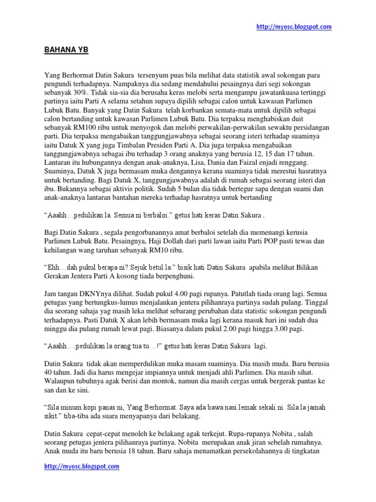 BAHANA YB Yang Berhormat Datin Sakura tersenyum puas bila melihat data statistik awal sokongan para pengundi terhadapnya. Nampaknya dia sedang mendahului pesaingnya dari segi sokongan sebanyak 30%. Tidak sia-sia dia berusaha keras melobi serta mengampu jawatankuasa tertinggi partinya iaitu Parti A selama setahun supaya dipilih sebagai calon untuk kawasan Parlimen Lubuk Batu. Banyak yang Datin Sakura telah korbankan semata-mata untuk dipilih sebagai calon bertanding untuk kawasan Parlimen Lubuk Batu. Dia terpaksa menghabiskan duit sebanyak RM100 ribu untuk menyogok dan melobi perwakilan-perwakilan sewaktu persidangan parti. Dia terpaksa mengabaikan tanggungjawabnya sebagai seorang isteri terhadap suaminya iaitu Datuk X yang juga Timbalan Presiden Parti A. Dia juga terpaksa mengabaikan tanggungjawabnya sebagai ibu terhadap 3 orang anaknya yang berusia 12, 15 dan 17 tahun. Lantaran itu hubungannya dengan anak-anaknya, Lisa, Dania dan Faizal enjadi renggang. Suaminya, Datuk X juga bermasam muka dengannya kerana suaminya tidak merestui hasratnya untuk bertanding. Bagi Datuk X, tanggungjawabnya adalah di rumah sebagai seorang isteri dan ibu. Bukannya sebagai aktivis politik. Sudah 5 bulan dia tidak bertegur sapa dengan suami dan anak-anaknya lantaran bantahan mereka terhadap hasratnya untuk bertanding Aaahhpedulikan la. Semua ni berbaloi. getus hati keras Datin Sakura . Bagi Datin Sakura , segala pengorbanannya amat berbaloi setelah dia memenangi kerusia Parlimen Lubuk Batu. Pesaingnya, Haji Dollah dari parti lawan iaitu Parti POP pasti tewas dan kehilangan wang taruhan sebanyak RM10 ribu. Ehhdah pukul berapa ni? Sejuk betul la. bisik hati Datin Sakura apabila melihat Bilikan Gerakan Jentera Parti A kosong tiada berpenghuni. Jam tangan DKNYnya dilihat. Sudah pukul 4.00 pagi rupanya. Patutlah tiada orang lagi. Semua petugas yang bertungkus-lumus menjalankan jentera pilihanraya partinya sudah pulang. Tinggal dia seorang sahaja yag masih leka melihat sebarang perubahan data statistic sokongan pengundi terhadapnya. Pasti Datuk X akan lebih bermasam muka lagi kerana masuk hari ini sudah dua minggu dia pulang rumah lewat pagi. Biasanya dalam pukul 2.00 pagi hingga 3.00 pagi. Aaahh.pedulikan la orang tua tu! getus hati keras Datin Sakura lagi. Datin Sakura tidak akan memperdulikan muka masam suaminya. Dia masih muda. Baru berusia 40 tahun. Jadi dia harus mengejar impiannya untuk menjadi ahli Parlimen. Dia masih sihat. Walaupun tubuhnya agak berisi dan montok, namun dia masih cergas untuk bergerak pantas ke san dan ke sini. Sila minum kopi panas ni, Yang Berhormat. Saya ada bawa nasi lemak sekali ni. Sila la jamah sikit. tiba-tiba ada suara menyapanya dari belakang. Datin Sakura cepat-cepat menoleh ke belakang agak terkejut. Rupa-rupanya Nobita , salah seorang petugas jentera pilihanraya partinya. Nobita merupakan anak jiran sebelah rumahnya. Anak muda itu baru berusia 18 tahun. Baru sahaja menamatkan persekolahannya di tingkatan
