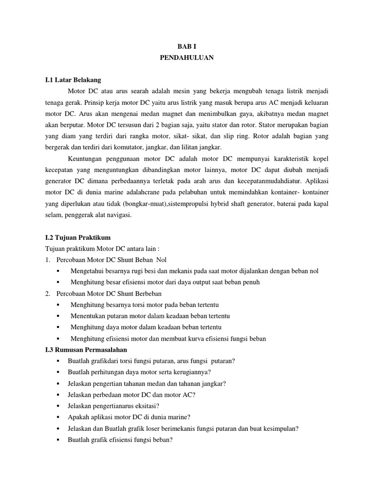 I.1 Latar Belakang Motor DC atau arus searah adalah mesin yang bekerja mengubah tenaga listrik menjadi tenaga gerak. Prinsip kerja motor DC yaitu arus listrik yang masuk berupa arus AC menjadi keluaran motor DC. Arus akan mengenai medan magnet dan menimbulkan gaya, akibatnya medan magnet akan berputar. Motor DC tersusun dari 2 bagian saja, yaitu stator dan rotor. Stator merupakan bagian yang diam yang terdiri dari rangka motor, sikat- sikat, dan slip ring. Rotor adalah bagian yang bergerak dan terdiri dari komutator, jangkar, dan lilitan jangkar. Keuntungan penggunaan motor DC adalah motor DC mempunyai karakteristik kopel kecepatan yang menguntungkan dibandingkan motor lainnya, motor DC dapat diubah menjadi generator DC dimana perbedaannya terletak pada arah arus dan kecepatanmudahdiatur. Aplikasi motor DC di dunia marine adalahcrane pada pelabuhan untuk memindahkan kontainer- kontainer yang diperlukan atau tidak (bongkar-muat),sistempropulsi hybrid shaft generator, baterai pada kapal selam, penggerak alat navigasi.