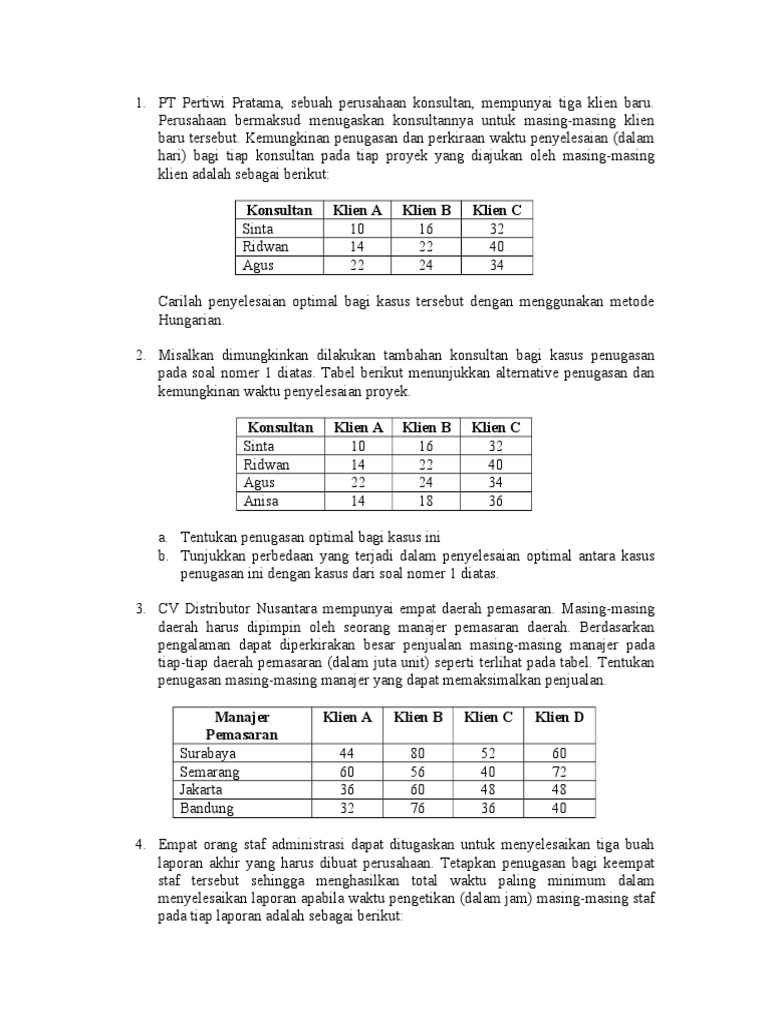 a. Tentukan penugasan optimal bagi kasus ini b. Tunjukkan perbedaan yang terjadi dalam penyelesaian optimal antara kasus penugasan ini dengan kasus dari soal nomer 1 diatas. 3. CV Distributor Nusantara mempunyai empat daerah pemasaran. Masing-masing daerah harus dipimpin oleh seorang manajer pemasaran daerah. Berdasarkan pengalaman dapat diperkirakan besar penjualan masing-masing manajer pada tiap-tiap daerah pemasaran (dalam juta unit) seperti terlihat pada tabel. Tentukan penugasan masing-masing manajer yang dapat memaksimalkan penjualan. Manajer Pemasaran Surabaya Semarang Jakarta Bandung Klien A 44 60 36 32 Klien B 80 56 60 76 Klien C 52 40 48 36 Klien D 60 72 48 40