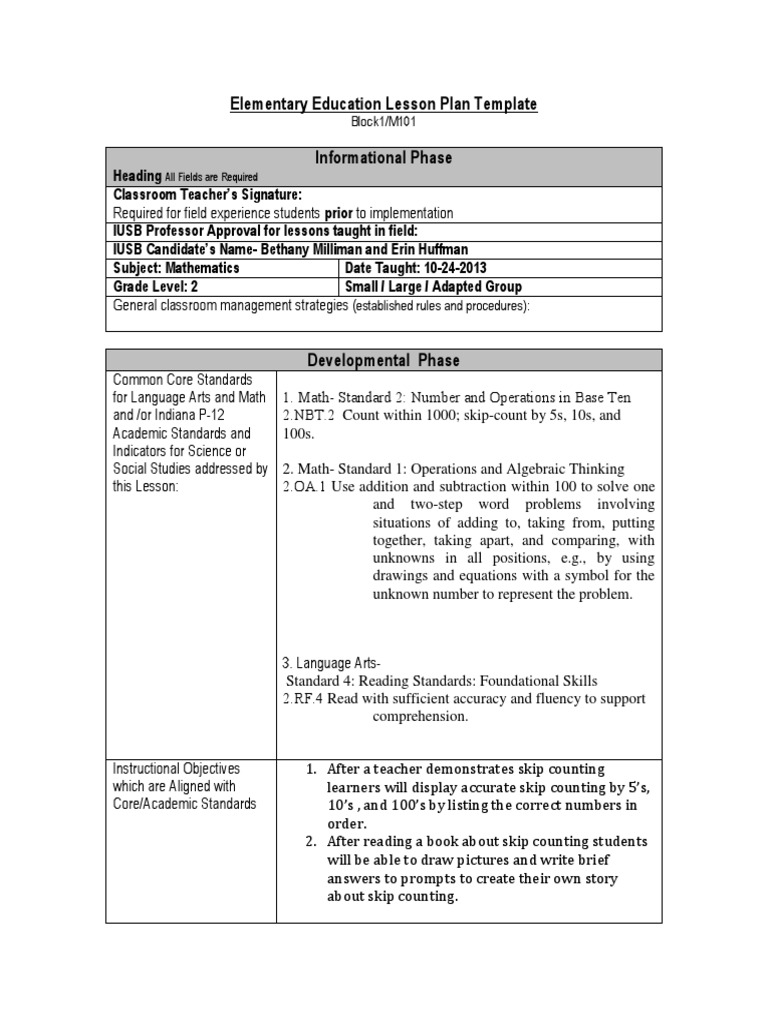Heading All Fields are Required Classroom Teachers Signature: Required for field experience students prior to implementation IUSB Professor Approval for lessons taught in field: IUSB Candidates Name- Bethany Milliman and Erin Huffman Subject: Mathematics Date Taught: 10-24-2013 Grade Level: 2 Small / Large / Adapted Group General classroom management strategies (established rules and procedures):