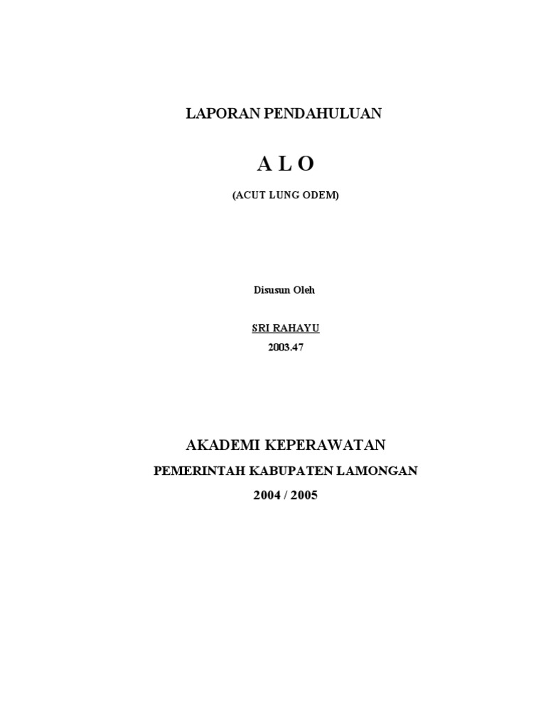 ASUHAN KEPERAWATAN PADA KLIEN DENGAN ALO (ACUT LUNG ODEM) 1. LANDASAN TEORI 1.1 Pengertian ALO atau Edema paru adalah timbunan cairan abnormal dalam paru baik di rongga interstisial dalam alveoli. (Bruner & Suddartk ; 798). ALO atau Edema paru adalah terkumpulnya cairan ekstravaskuler yang patologis di dalam paru.(Soeparman ; 767) 1.2 ETIOLOGI Penyebab acut odem secara umum dapat digolongkan menjadi dua yaitu : 1.2.1 Edema Paru Kardiogenik Yaitu edema paru yang disebabkan karena gangguan pada jantung atau sistem kardiovaskuler seperti penyakit jantung aterosklerotik, hipertensi, kelainan katup, decompensasi cordis. 1.2.2 Edema paru non kardiogenik Yaitu edema paru yang bukan disebabkan karena kelainan pada jantung tetapi paru itu sendiri seperti : 1.2.2.1 Kelompok dengan ketidakseimbangan tenaga starling 1) Peningkatan tekanan kapiler paru. Oleh karena peningkatan tekanan darah vena paru, misalnya pada stenosis batub mitral, gagal jantung kiri, overload cairan infus. 2) Penurunan tekanan onkotis plasma oleh karena hipoalbuminemia. 3) Peningkatan Negativitas tekanan interstisial Pengosongan udara secara tiba tiba dan dalam jumlah yang besar pada pneumotoraks (unilateral) maupun pada efusi pleura juga tekanan negatif yang sangat besar, misalnya pada serangan asma berat. 4) Peningkatan tekanan onkotis interstisial