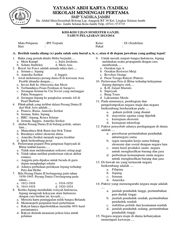 Jln. Abdul Muis/Jerambah Bolong Lrg. Anggrek RT 38 Kel. Lingkar Selatan Jambi Kec. Jambi Selatan Kota Jambi Telp. (0741) 573735 KISI-KISI UJIAN SEMESTER GANJIL TAHUN PELAJARAN 2013/2014 Mata Pelajaran Hari : IPS Terpadu : Kelas Pukul : IX (Sembilan) :