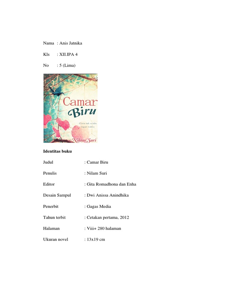 Identitas buku Judul Penulis Editor Desain Sampul Penerbit Tahun terbit Halaman Ukuran novel : Camar Biru : Nilam Suri : Gita Romadhona dan Enha : Dwi Anissa Anindhika : Gagas Media : Cetakan pertama, 2012 : Viii+ 280 halaman : 13x19 cm