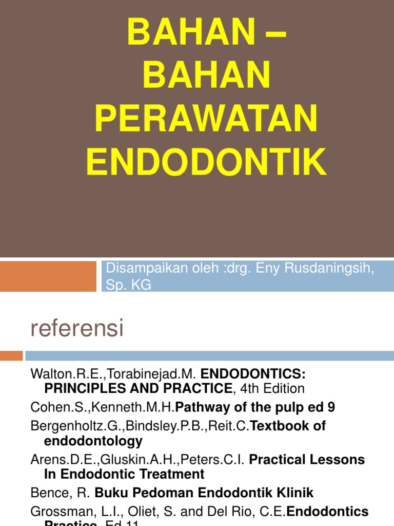 Walton.R.E.,Torabinejad.M. ENDODONTICS: PRINCIPLES AND PRACTICE, 4th Edition Cohen.S.,Kenneth.M.H.Pathway of the pulp ed 9 Bergenholtz.G.,Bindsley.P.B.,Reit.C.Textbook of endodontology Arens.D.E.,Gluskin.A.H.,Peters.C.I. Practical Lessons In Endodontic Treatment Bence, R. Buku Pedoman Endodontik Klinik Grossman, L.I., Oliet, S. and Del Rio, C.E.Endodontics Practice. Ed 11 Tarigan, R. Perawatan Pulpa Gigi. JOE (Journal of Endodontic)