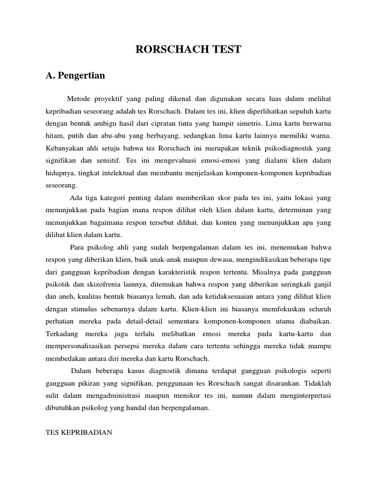 LATAR BELAKANG RORSCHACH Orang yang pertama kali menaruh perhatian pada bercak tinta justinus kerner. Dia mulai menyadari bahwa dari bercak tinta ternyata orang dapat melihat objek di dalamnya dengan tulisanya berjudul kleksographein yang terbit pada tahun 1857 di tubingen jerman, justonus kerner dapat dipandang sebagai pelopor dalam bercak tinta. Alfred binet pada tahun 1895 yang dikenal dalam tes intelegensi menyarankan bahwa bercak tinta dapat digunakan untuk menyelidiki imajinasi visual seseorang. Setahun kemudian 1896 dearborn dari harvard university menulis artikel yang mencerikan bagaimana menjelaskan bercak tinta ini, baik yang hitam putih maupun yang berwarna. Dia juga menyarankan untuk mengadakan eksperimen eksperimen di bidang psikologi untuk menggunakan bercak tinta ini. Dari eksperimanya sendiri dearborn menggunakan 12 seri bercak tinta yang masing masing terdiri dari 10 kartu. Bercak tinta tersebut kemudian diberikan kepada sekelompok subjek yang terdiri dari mahasiswa maupun dosen di harvard university. Dan eksperimen itu disimpulkan bahwa pengalaman masa lalu, terutama pengalaman masa kecil, mempunyai pengaruh terhadap bercak tinta tersebut.