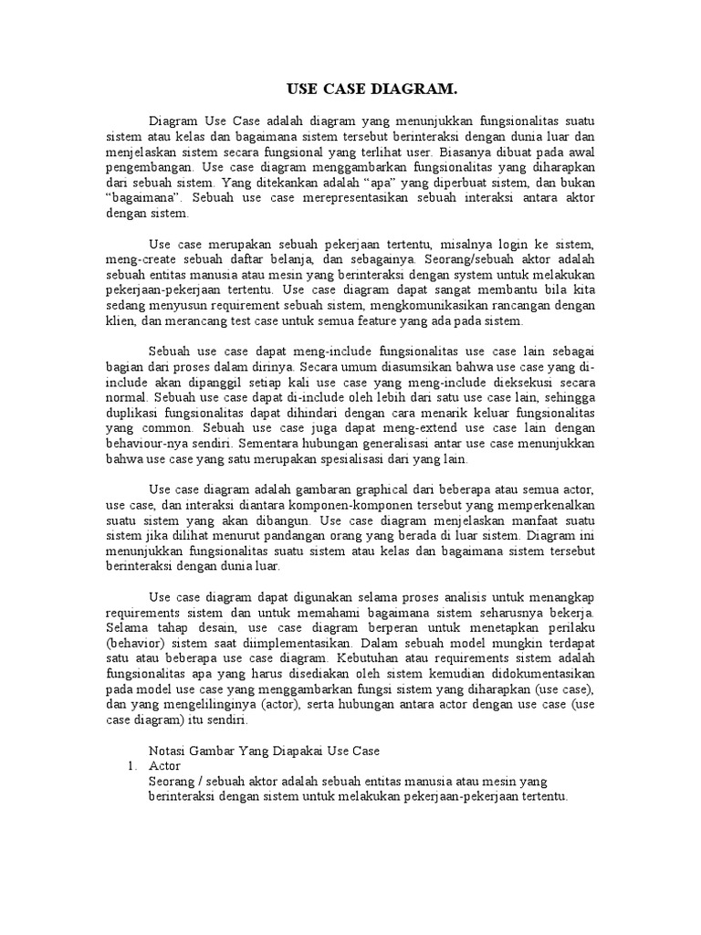 Diagram Use Case adalah diagram yang menunjukkan fungsionalitas suatu sistem atau kelas dan bagaimana sistem tersebut berinteraksi dengan dunia luar dan menjelaskan sistem secara fungsional yang terlihat user. Biasanya dibuat pada awal pengembangan. Use case diagram menggambarkan fungsionalitas yang diharapkan dari sebuah sistem. Yang ditekankan adalah apa yang diperbuat sistem dan bukan bagaimana. !ebuah use case merepresentasikan sebuah interaksi antara aktor dengan sistem. Use case merupakan sebuah pekerjaan tertentu misalnya login ke sistem meng"create sebuah daftar belanja dan sebagainya. !eorang#sebuah aktor adalah sebuah entitas manusia atau mesin yang berinteraksi dengan system untuk melakukan pekerjaan"pekerjaan tertentu. Use case diagram dapat sangat membantu bila kita sedang menyusun re$uirement sebuah sistem mengkomunikasikan rancangan dengan klien dan merancang test case untuk semua feature yang ada pada sistem. !ebuah use case dapat meng"include fungsionalitas use case lain sebagai bagian dari proses dalam dirinya. !ecara umum diasumsikan bahwa use case yang di" include akan dipanggil setiap kali use case yang meng"include dieksekusi secara normal. !ebuah use case dapat di"include oleh lebih dari satu use case lain sehingga duplikasi fungsionalitas dapat dihindari dengan cara menarik keluar fungsionalitas yang common. !ebuah use case juga dapat meng"e%tend use case lain dengan beha&iour"nya sendiri. !ementara hubungan generalisasi antar use case menunjukkan bahwa use case yang satu merupakan spesialisasi dari yang lain. Use case diagram adalah gambaran graphical dari beberapa atau semua actor use case dan interaksi diantara komponen"komponen tersebut yang memperkenalkan suatu sistem yang akan dibangun. Use case diagram menjelaskan manfaat suatu sistem jika dilihat menurut pandangan orang yang berada di luar sistem. Diagram ini menunjukkan fungsionalitas suatu sistem atau kelas dan bagaimana sistem tersebut berinteraksi dengan dunia luar. Use case diagram dapat digunakan selama proses analisis untuk menangkap re$uirements sistem dan untuk memahami bagaimana sistem seharusnya bekerja. !elama tahap desain use case diagram berperan untuk menetapkan perilaku 'beha&ior( sistem saat diimplementasikan. Dalam sebuah model mungkin terdapat satu atau beberapa use case diagram. )ebutuhan atau re$uirements sistem adalah fungsionalitas apa yang harus disediakan oleh sistem kemudian didokumentasikan pada model use case yang menggambarkan fungsi sistem yang diharapkan 'use case( dan yang mengelilinginya 'actor( serta hubungan antara actor dengan use case 'use case diagram( itu sendiri. *otasi +ambar Yang Diapakai Use Case ,. -ctor !eorang # sebuah aktor adalah sebuah entitas manusia atau mesin yang berinteraksi dengan sistem untuk melakukan pekerjaan"pekerjaan tertentu.