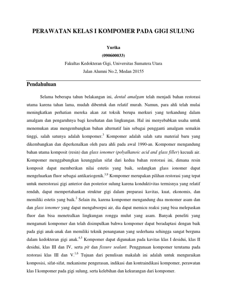 Selama beberapa tahun belakangan ini, dental amalgam telah menjadi bahan restorasi utama karena tahan lama, mudah dibentuk dan relatif murah. Namun, para ahli telah mulai meningkatkan perhatian mereka akan zat toksik berupa merkuri yang terkandung dalam amalgam dan pengaruhnya bagi kesehatan dan lingkungan. Hal ini menyebabkan usaha untuk menemukan atau mengembangkan bahan alternatif lain sebagai pengganti amalgam semakin tinggi, salah satunya adalah kompomer.3 Kompomer adalah salah satu material baru yang dikembangkan dan diperkenalkan oleh para ahli pada awal 1990-an. Kompomer mengandung bahan utama komposit (resin) dan glass ionomer (polyalkanoic acid and glass filler) kecuali air. Kompomer menggabungkan keunggulan sifat dari kedua bahan restorasi ini, dimana resin komposit dapat memberikan nilai estetis yang baik, sedangkan glass ionomer dapat mengeluarkan fluor sebagai antikariogenik.3,9 Kompomer merupakan pilihan restorasi yang tepat untuk merestorasi gigi anterior dan posterior sulung karena konduktivitas termisnya yang relatif rendah, dapat mempertahankan struktur gigi dalam preparasi kavitas, kuat, ekonomis, dan memiliki estetis yang baik.2 Selain itu, karena kompomer mengandung dua monomer asam dan dan glass ionomer yang dapat mengabsorpsi air, dia dapat memicu reaksi yang bisa melepaskan fluor dan bisa menetralkan lingkungan rongga mulut yang asam. Banyak peneliti yang mengamati kompomer dan telah disimpulkan bahwa kompomer dapat beradaptasi dengan baik pada gigi anak-anak dan memiliki teknik penanganan yang sederhana sehingga sangat berguna dalam kedokteran gigi anak.4,5 Kompomer dapat digunakan pada kavitas klas I desidui, klas II desidui, klas III dan IV, serta pit dan fissure sealant. Penggunaan kompomer terutama pada restorasi klas III dan V.1,6 Tujuan dari penulisan makalah ini adalah untuk menguraikan komposisi, sifat-sifat, mekanisme pengerasan, indikasi dan kontraindikasi kompomer, perawatan klas I kompomer pada gigi sulung, serta kelebihan dan kekurangan dari kompomer.