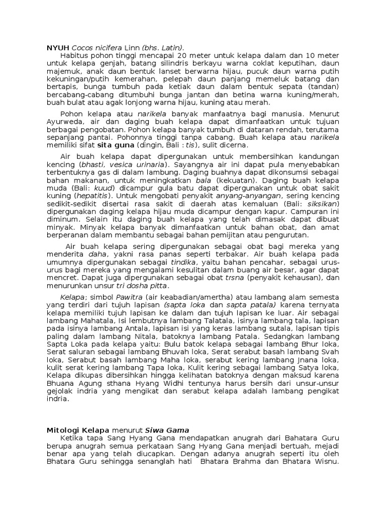 Nyuh Surya yuh )urya tergolong kelapa dalam ciri khasnya dan pucuk warna kuning merah menyala, buah muda warna kuning kemerahan digunakan pada banten panglukatan, untuk obat! Nyuh Udang yuh *dang ciri khasnya, tapuk buahnya merah, serabut buah warna warna merah digunakan pada caru dan untuk campuran obat! enggunaan Nyuh/Kelapa dala" Upa$ara Manusa Yadnya. Nyuh pada Upa$ara Garbha%edana *pacara $arbhawedana atau *pacara &egedong-gedongan adalah upacara yang dilaksanakan ketika bayi masih berada dalam kandungan dengan umur di atas lima bulan menurut perhitungan kalender &ali! )alam upacara ini banten yang digunakan memiliki simbol simbol yang merupakan perwujudan dari ajaran +eda! #anten yang digunakan pada upacara ini adalah banten daksina, banten pe"ati, banten beyakala, dan banten pegedong-gedongan, untuk tingkat yang lebih besar menggunakan banten suci, banten bebangkit, banten caru, dan banten pengelukatan, &uah kelapa yang digunakan dalam upacara ini adalah yuh $ading dalam banten pagedong-gedongan, ((udarsana, 200>'20)! %dapun ciri ciri dari yuh $ading yakni, ukuran buah kecil kecil, berwarna kuning kemerah merahan (orange) dari buah, tangkai, bunga, pelepah hingga ke daun! 2emudian banten daksina menggunakan kelapa !ncak, kelapa ,nggalan, kelapa #e -ulit, kelapa #ebed, kelapa #ingin, kelapa Cenik, 2elapa #o"og, kelapa hijau atau $adang, kelapa $latik, kelapa Kebat, kelapa Kapas, kelapa &ulung, kelapa aga, kelapa )angket, kelapa )uda%ala, kelapa )urya, kelapa *dang, kelapa Ketan, kelapa #rah%a, kelapa puuh, kelapa )ela, kelapa kelapa dan kelapa &acan untuk banten )uci menggunakan kelapa &ulung yang masih muda kalau tidak ada kelapa &ulung bisa diganti dengan kelapa $adang (elanjutnya untuk banten bebangkit dalam buku .a%an $u%i #anten ,nsikoledi .ana%an *pakara disebutkan buah kelapa yang digunakan adalah yuh #e -ulit, yuh #ebed, yuh #ulan, yuh Cenik.! 2emudian untuk banten penglukatan jenis kelapa yang digunakan adalah 2elapa $ading, bisa juga kelapa #ulan, kelapa )urya, kelapa &ulung, kelapa #e -ulit, dan kelapa *dang kalau kelapa $ading tidak ada! 2emudian untuk kelengkapan banten caru buah kelapa yang digunakan adalah yuh !ncak, yuh ,nggalan, yuh #ebed, yuh beruk, yuh #ingin, yuh #o"og, yuh $latik, yuh Kebat, yuh Kapas, yuh &ulung, yuh aga, yuh )angket, yuh aga, yuh )uda%ala, yuh )urya, *dang, yuh ,%pas, yuh Ketan, nyuh #rah%a, yuh &acan, yuh (angda , dan yuh )ela! )ari tiga puluh lima (=?) jenis kelapa, dalam *pacara $arbhawedana buah kelapa yang digunakan adalah' kelapa !ncak, kelapa ,nggalan, kelapa #e -ulit, kelapa #ebed, kelapa #ingin, kelapa Cenik, kelapa #o"og, kelapa $adang, kelapa $latik, kelapa Kebat, kelapa Kapas, kelapa aga, kelapa )angket, kelapa )uda%ala, kelapa )urya, kelapa *dang, kelapa Ketan, kelapa #rah%a, kelapa puuh, kelapa )ela, kelapa (angda, kelapa $ading, kelapa #ulan, 2elapa &acan, dan kelapa &ulung.