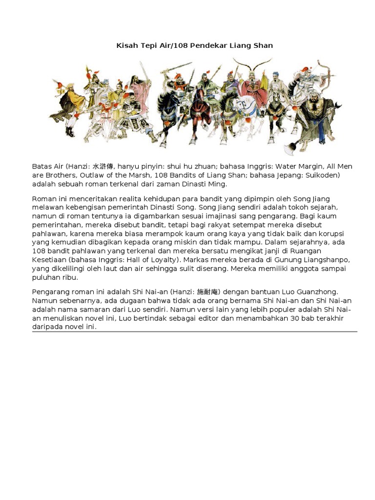 Batas Air (Hanzi: , hanyu pinyin: shui hu zhuan; bahasa Inggris: Water Margin, All Men are Brothers, Outlaw of the Marsh, 1 ! Ban"its of #iang $han; bahasa %epang: $ui&o"en' a"alah sebuah ro(an ter&enal "ari za(an )inasti Ming* +o(an ini (en,erita&an realita &ehi"upan para ban"it yang "ipi(pin oleh $ong %iang (elawan &ebengisan pe(erintah )inasti $ong* $ong %iang sen"iri a"alah to&oh se-arah, na(un "i ro(an tentunya ia "iga(bar&an sesuai i(a-inasi sang pengarang* Bagi &au( pe(erintahan, (ere&a "isebut ban"it, tetapi bagi ra&yat sete(pat (ere&a "isebut pahlawan, &arena (ere&a biasa (era(po& &au( orang &aya yang ti"a& bai& "an &orupsi yang &e(u"ian "ibagi&an &epa"a orang (is&in "an ti"a& (a(pu* )ala( se-arahnya, a"a 1 ! ban"it pahlawan yang ter&enal "an (ere&a bersatu (engi&at -an-i "i +uangan .esetiaan (bahasa Inggris: Hall of #oyalty'* Mar&as (ere&a bera"a "i /unung #iangshanpo, yang "i&elilingi oleh laut "an air sehingga sulit "iserang* Mere&a (e(ili&i anggota sa(pai puluhan ribu* 0engarang ro(an ini a"alah $hi 1ai2an (Hanzi: ' "engan bantuan #uo /uanzhong* 1a(un sebenarnya, a"a "ugaan bahwa ti"a& a"a orang berna(a $hi 1ai2an "an $hi 1ai2an a"alah na(a sa(aran "ari #uo sen"iri* 1a(un 3ersi lain yang lebih populer a"alah $hi 1ai2 an (enulis&an no3el ini, #uo bertin"a& sebagai e"itor "an (ena(bah&an 4 bab tera&hir "aripa"a no3el ini*