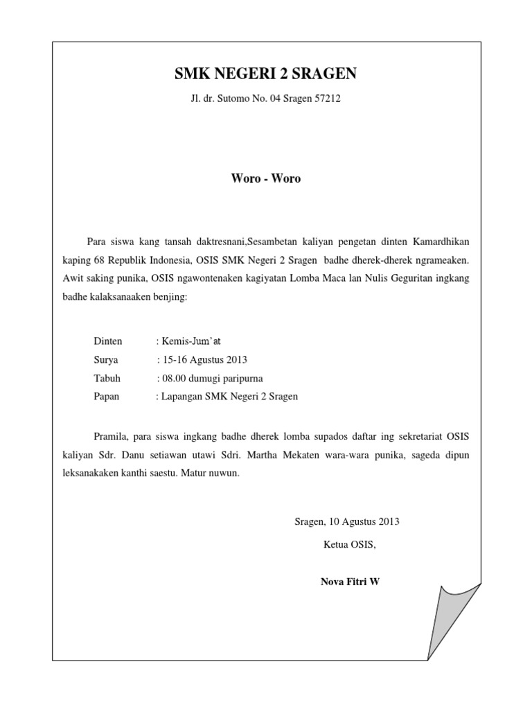 Pramila, para siswa ingkang badhe dherek lomba supados daftar ing sekretariat OSIS kaliyan Sdr. Danu setiawan utawi Sdri. Martha Mekaten wara-wara punika, sageda dipun leksanakaken kanthi saestu. Matur nuwun.