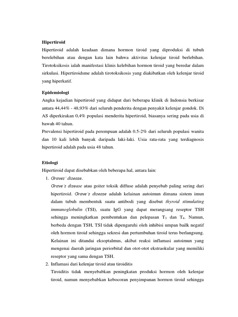 bahwa aktivitas kelenjar tiroid berlebihan. Tirotoksikosis ialah manifestasi klinis kelebihan hormon tiroid yang beredar dalam sirkulasi. Hipertiroidsme adalah tirotoksikosis yang diakibatkan oleh kelenjar tiroid yang hiperkatif. Epidemiologi Angka kejadian hipertiroid yang didapat dari beberapa klinik di Indonsia berkisar antara 44,44% - 48,93% dari seluruh penderita dengan penyakit kelenjar gondok. Di AS diperkirakan 0,4% populasi menderita hipertiroid, biasanya sering pada usia di bawah 40 tahun. Prevalensi hipertiroid pada perempuan adalah 0.5-2% dari seluruh populasi wanita dan 10 kali lebih banyak daripada laki-laki. Usia rata-rata yang terdiagnosis hipertiroid adalah pada usia 48 tahun.
