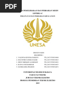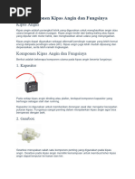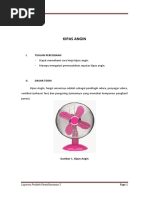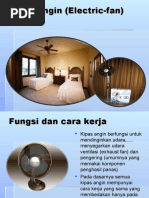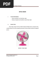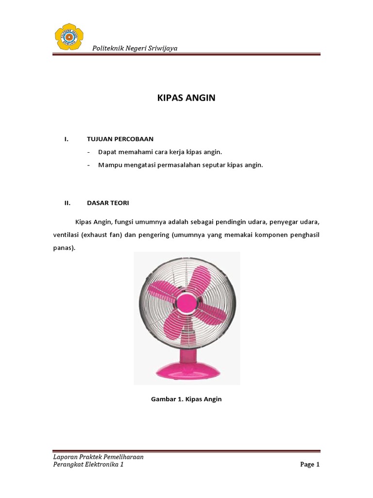 Politeknik Negeri Sriwijaya I. CARA KERJA KIPAS ANGIN Pada umumnya cara kerja kipas angin ada pada pemutar kipas angin yang digerakkan oleh motor listrik. Prinsip kerja yang digunakan adalah mengubah energy listrik menjadi energy gerak. Dalam sebuah motor listrik terdaoat sebuah kumparan besi pada bagian yang bergerak berserta sepasang magnet U berbentuk pipih pada bagian yang diam (permanen). Listrik yang mengalir pada lilitan kawat dalam kumparan besi akan membuat kumparan besi menjadi sebuah magnet. Karena sifat magnet yang saling tolak pada sebuah kutub, gaya tolak menolak magnet antara kumparan besi dan magnet membuat gaya berputas secara periodik pada kumparan besi tersebut. Akibatnya, baling-balling kipas angin yang dikaitkan ke poros kumparan dapat berputar. Penambahan tegangan listrik pada kumparan besi, yang akan menjadi gaya kemagnetan ditunjukan untuk memperbesar embusan angin pada kipas angin. Pada dasarnya semua jenis kipas angin mempunyai cara kerja yang sama, yang membedakan hanya pada posisi penempatan kipas angin. Berikut jenis-jenis kipas angin yang umumnya digunakan dalam rumah tangga. 1. Kipas Angin berdiri (Standfan). 2. Kipas Angin duduk atau meja (deskfan). 3. Kipas Angin dinding (wallfan). 4. Kipas Angin langi-langit (orbitfan).