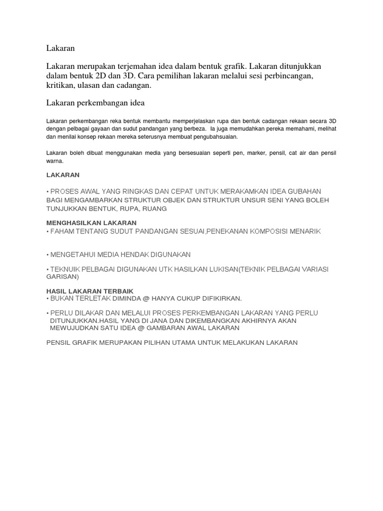 LAKARAN PROSES AWAL YANG RINGKAS DAN CEPAT UNTUK MERAKAMKAN IDEA GUBAHAN BAGI MENGAMBARKAN STRUKTUR OBJEK DAN STRUKTUR UNSUR SENI YANG BOLEH TUNJUKKAN BENTUK, RUPA, RUANG MENGHASILKAN LAKARAN FAHAM TENTANG SUDUT PANDANGAN SESUAI,PENEKANAN KOMPOSISI MENARIK MENGETAHUI MEDIA HENDAK DIGUNAKAN TEKNUIK PELBAGAI DIGUNAKAN UTK HASILKAN LUKISAN(TEKNIK PELBAGAI VARIASI GARISAN) HASIL LAKARAN TERBAIK BUKAN TERLETAK DIMINDA @ HANYA CUKUP DIFIKIRKAN. PERLU DILAKAR DAN MELALUI PROSES PERKEMBANGAN LAKARAN YANG PERLU DITUNJUKKAN.HASIL YANG DI JANA DAN DIKEMBANGKAN AKHIRNYA AKAN MEWUJUDKAN SATU IDEA @ GAMBARAN AWAL LAKARAN PENSIL GRAFIK MERUPAKAN PILIHAN UTAMA UNTUK MELAKUKAN LAKARAN