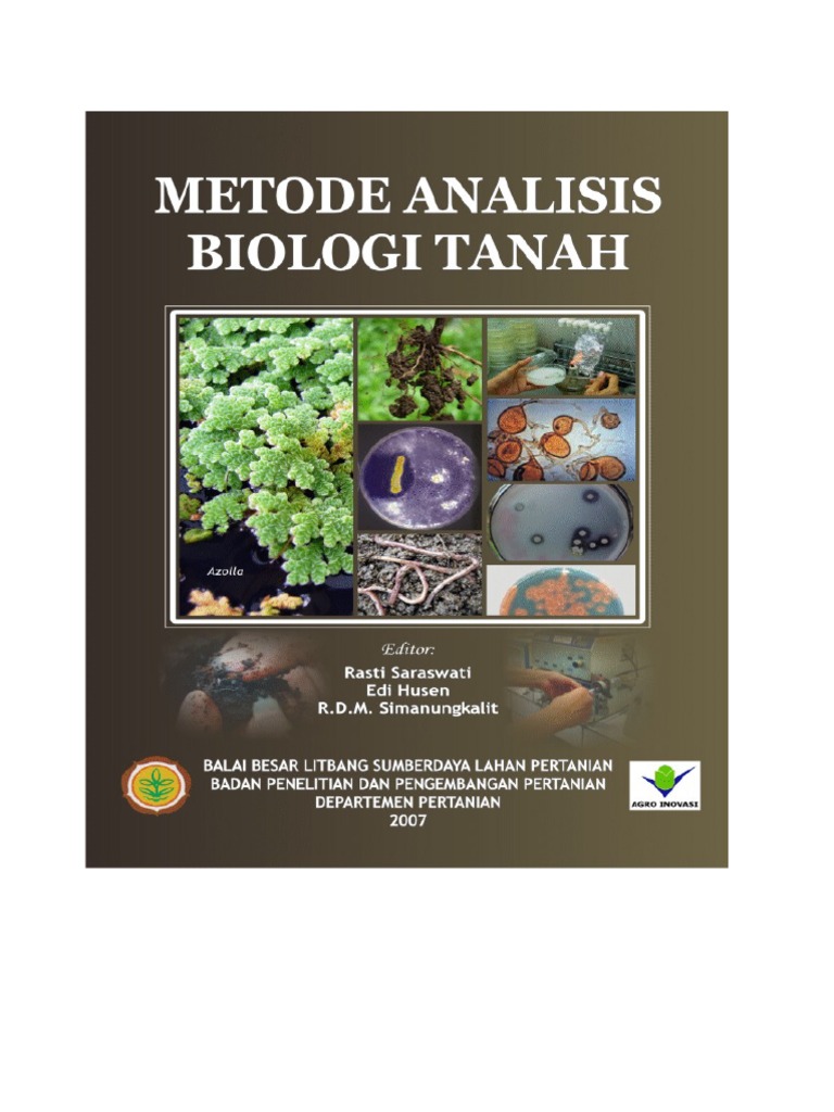 Peran biologi tanah dalam meningkatkan produktivitas lahan menjadi semakin penting ke depan ini karena makin meluasnya lahan pertanian yang salah kelola dan makin terbatasnya sumber daya pupuk anorganik. Berbagai jenis mikroba dan fauna tanah telah diketahui berpotensi sebagai pupuk hayati dan berbagai atribut biologi tanah mulai banyak digunakan sebagai indikator kualitas dan kesehatan tanah. Untuk itu, dalam eksplorasi dan telaah pemanfaatan biologi tanah perlu ditunjang oleh suatu penuntun analisis yang memadai agar data yang dihasilkan dapat diandalkan dalam menyusun teknologi pengelolaan tanah yang tepat. Buku metode analisis biologi tanah ini merupakan buku pertama penuntun analisis biologi tanah yang diterbitkan oleh Balai Besar Litbang Sumberdaya Lahan Pertanian. Di dalam buku ini dijelaskan prosedur analisis berbagai jenis dan atribut biologi tanah yang disajikan dalam empat Bab besar dan terdiri atas 29 judul prosedur dan analisis. Dengan diterbitkannya buku ini, diharapkan dapat bermanfaat bagi para pengguna sebagai salah satu acuan dalam analisis biologi tanah. Ucapan terima kasih disampaikan kepada Balai Penelitian Tanah dan semua pihak yang telah berkontribusi dalam penyelesaian buku ini.
