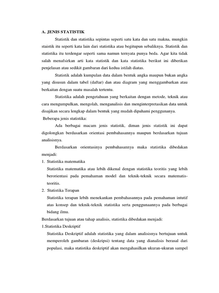 JENIS STATISTIK Statistik dan statistika sepintas seperti satu kata dan satu makna, mungkin staistik itu seperti kata lain dari statistika atau begitupun sebaliknya. Statistik dan statistika itu terdengar seperti sama namun ternyata punya beda. Agar kita tidak salah menafsirkan arti kata statistik dan kata statistika berikut ini diberikan penjelasan atau sedikit gambaran dari kedua istilah diatas. Statistik adalah kumpulan data dalam bentuk angka maupun bukan angka yang disusun dalam tabel (daftar) dan atau diagram yang menggambarkan atau berkaitan dengan suatu masalah tertentu. Statistika adalah pengetahuan yang berkaitan dengan metode, teknik atau cara mengumpulkan, mengolah, menganalisis dan menginterpretasikan data untuk disajikan secara lengkap dalam bentuk yang mudah dipahami penggunanya. Beberapa jenis statistika: Ada berbagai macam jenis statistik, diman jenis statistik ini dapat digolongkan berdasarkan orientasi pembahasannya maupun berdasarkan tujuan analisisnya. Berdasarkan orientasinya pembahasannya maka statistika dibedakan menjadi: 1. Statistika matematika Statistika matematika atau lebih dikenal dengan statistika teoritis yang lebih berorientasi pada pemahaman model dan teknik-teknik secara matematisteoritis. 2. Statistika Terapan Statistika terapan lebih menekankan pembahasannya pada pemahaman intutif atas konsep dan teknik-teknik statistika serta penggunaannya pada berbagai bidang ilmu. Berdasarkan tujuan atau tahap analisis, statistika dibedakan menjadi: 1.Statistika Deskriptif Statistika Deskriptif adalah statistika yang dalam analisisnya bertujuan untuk memperoleh gambaran (deskripsi) tentang data yang dianalisis berasal dari populasi, maka statistika deskriptif akan mengahasilkan ukuran-ukuran sampel