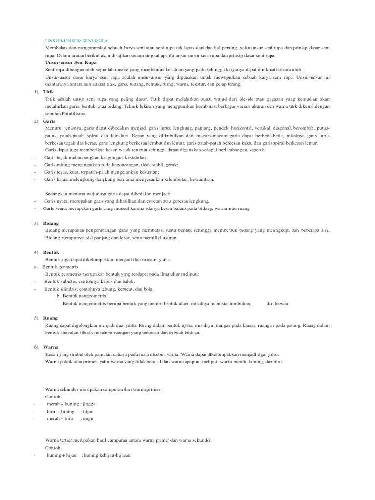 dua hal penting, yaitu unsur seni rupa dan prinsip dasar seni rupa. Dalam uraian berikut akan disajikan secara singkat apa itu unsur-unsur seni rupa dan prinsip dasar seni rupa. Unsur-unsur Seni Rupa Seni rupa dibangun oleh sejumlah unsure yang membentuk kesatuan yang padu sehingga karyanya dapat dinikmati secara utuh. Unsur-unsur dasar karya seni rupa adalah unsur-unsur yang digunakan untuk mewujudkan sebuah karya seni rupa. Unsur-unsur ini diantaranya antara lain adalah titik, garis, bidang, bentuk, ruang, warna, tekstur, dan gelap terang. 1). Titik Titik adalah unsur seni rupa yang paling dasar. Titik dapat melahirkan suatu wujud dari ide-ide atau gagasan yang kemudian akan melahirkan garis, bentuk, atau bidang. Teknik lukisan yang menggunakan kombinasi berbagai variasi ukuran dan warna titik dikenal dengan sebutan Pointilisme. 2). Garis Menurut jenisnya, garis dapat dibedakan menjadi garis lurus, lengkung, panjang, pendek, horizontal, vertikal, diagonal, berombak, putusputus, patah-patah, spiral dan Iain-Iain. Kesan yang ditimbulkan dari macam-macam garis dapat berbeda-beda, misalnya garis lurus berkesan tegak dan keras, garis lengkung berkesan lembut dan lentur, garis patah-patah berkesan kaku, dan garis spiral berkesan lentur. Garis dapat juga memberikan kesan watak tertentu sehingga dapat digunakan sebagai perlambangan, seperti: Garis tegak melambangkan keagungan, kestabilan; Garis miring mengingatkan pada kegoncangan, tidak stabil, gerak; Garis tegas, kuat, terpatah-patah mengesankan kekuatan; Garis halus, melengkung-lengkung berirama mengesankan kelembutan, kewanitaan.