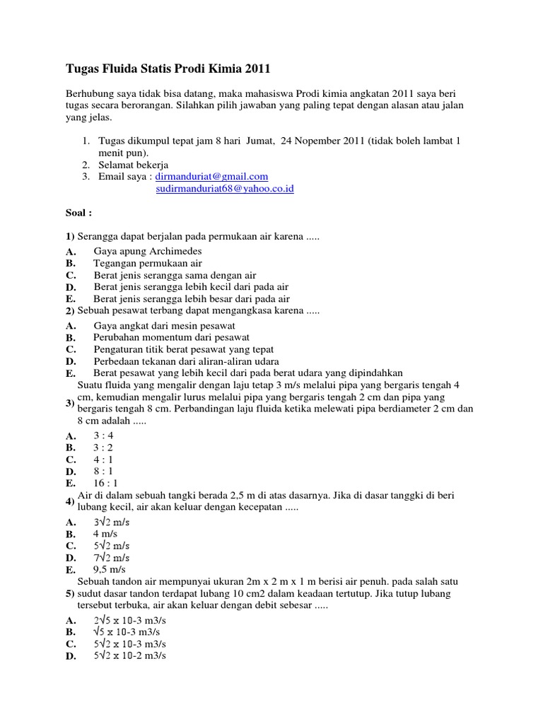 Berhubung saya tidak bisa datang, maka mahasiswa Prodi kimia angkatan 2011 saya beri tugas secara berorangan. Silahkan pilih jawaban yang paling tepat dengan alasan atau jalan yang jelas. 1. Tugas dikumpul tepat jam 8 hari Jumat, 24 Nopember 2011 (tidak boleh lambat 1 menit pun). 2. Selamat bekerja 3. Email saya : dirmanduriat@gmail.com sudirmanduriat68@yahoo.co.id Soal : 1) Serangga dapat berjalan pada permukaan air karena ..... Gaya apung Archimedes A. Tegangan permukaan air B. Berat jenis serangga sama dengan air C. Berat jenis serangga lebih kecil dari pada air D. Berat jenis serangga lebih besar dari pada air E. 2) Sebuah pesawat terbang dapat mengangkasa karena ..... Gaya angkat dari mesin pesawat A. Perubahan momentum dari pesawat B. Pengaturan titik berat pesawat yang tepat C. Perbedaan tekanan dari aliran-aliran udara D. Berat pesawat yang lebih kecil dari pada berat udara yang dipindahkan E. Suatu fluida yang mengalir dengan laju tetap 3 m/s melalui pipa yang bergaris tengah 4 cm, kemudian mengalir lurus melalui pipa yang bergaris tengah 2 cm dan pipa yang 3) bergaris tengah 8 cm. Perbandingan laju fluida ketika melewati pipa berdiameter 2 cm dan 8 cm adalah ..... 3:4 A. 3:2 B. 4:1 C. 8:1 D. 16 : 1 E. Air di dalam sebuah tangki berada 2,5 m di atas dasarnya. Jika di dasar tanggki di beri 4) lubang kecil, air akan keluar dengan kecepatan ..... 32 m/s A. 4 m/s B. 52 m/s C. 72 m/s D. 9,5 m/s E. Sebuah tandon air mempunyai ukuran 2m x 2 m x 1 m berisi air penuh. pada salah satu 5) sudut dasar tandon terdapat lubang 10 cm2 dalam keadaan tertutup. Jika tutup lubang tersebut terbuka, air akan keluar dengan debit sebesar ..... 25 x 10-3 m3/s A. 5 x 10-3 m3/s B. 52 x 10-3 m3/s C. 52 x 10-2 m3/s D.