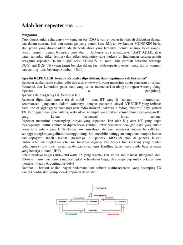 Pengantar: Yup, demikianlah seharusnya kegiatan berQSO lewat re peater hendaklah dilakukan dengan dan dalam suasana hati dan semangat yang penuh keceRIAan (walaupun MUNGKIN berita atau pesan yang disampaikan adalah berita duka yang tentunya penuh nuansa kedukaan), penuh empati, penuh tenggang rasa, dan tentunya juga sepenuhnya TAAT ADAB, alias patuh terhadap etika (ethics) dan etiket (etiquette) yang berlaku di lingkungan sesama amatir pengguna repeater. Dalam eQSP edisi KHUSUS ini, mari kita cermati bersama beberapa DO(s) and DONT(s) yang lazim berlaku dalam ber olahrepeater, seperti yang Editor kompail dan sunting dari beberapa sumber. [Ed.] Apa itu REPEATER, kenapa Repeater diperlukan, dan bagaimanakah kerjanya? Repeater adalah suatu sistim radio dua arah (two-way), yang menerima suatu pancaran di sebuah frekuensi, dan kemudian pada saat yang sama memancarkan ulang (to repeat = meng-ulang, repeater = pengulang) apa yang didengarnya di frekuensi lain, Repeater diperlukan karena rig di mobil atau HT yang di tangan mempunyai keterbatasan jangkauan, dalam kaitannya dengan pancaran sinyal VHF/UHF yang terbatas pada line of sight (garis pandang) atau radio horizon (cakrawala radio), menuruti daya pancar TX, ketinggian dan jenis antena, serta sikon setempat yang terkait kemungkinan penyerapan RF yang keluar (terpancar) lewat antena. Repeater menerima (menangkap) sinyal yang dipancar- kan oleh Rig atau HT yang dapat mencapainya, untuk kemudian dipancarkan kembali lewat pemancar den- gan daya yang cukup besar serta antena yang lebih efisien misalnya dengan memakai antena ber- dBGain setinggi mungkin yang ditaruh setinggi mung- kin, melebihi ketinggian bangunan maupun kontur dan topografi tanah sekitar (misalnya di puncak MONAS atau di puncak bukit). Untuk lebih meningkatkan efisiensi biasanya diguna- kan feeder line (saltran) yang rendah redamannya (low loss), misalnya dengan coax jenis Hardline (atau wave guide bagi repeater yang bekerja di band UHF). Selain berdaya tinggi (100200 watt) TX yang diguna- kan untuk me-mancar ulang-kan dan RXnya harus dari jenis yang bertingkat kehandalan tinggi dan sang- gup untuk bekerja terus menerus (heavy & continuous duty) Gambar 1 berikut adalah bagan sederhana dari sebuah sistim repeater, yang disamping TX dan RX terdiri dari komponen-komponen dasar sbb. :
