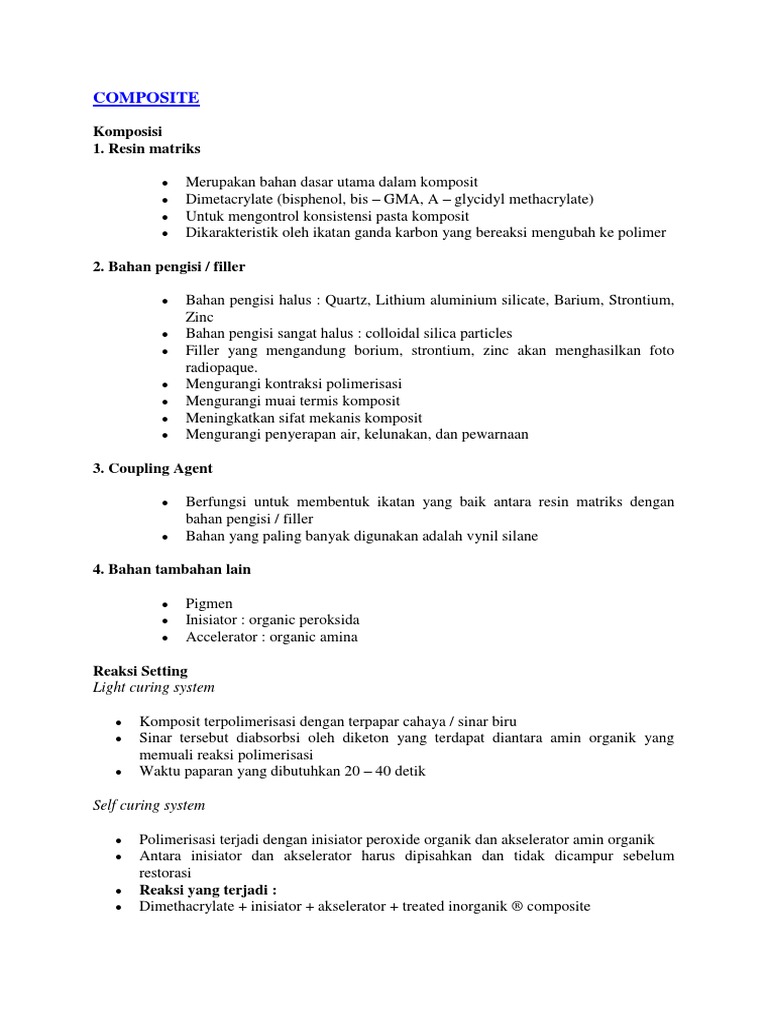 Untuk membentuk ikatan antara composite dan struktur gigi maka gigi harus dietsa Dengan menggunakan bonding agent, enamel dan dentin pada kavitas preparasi dietsa dengan asam selama 30 detik yang mengandung 10%-15% / 34%-37% gel / cairan asam fosfat. Asam tersebut kemudian dibasuh dengan air dan permukaannya dikeringakan dengan aliran udara Permukaan gigi yang sudah dietsa tampak kusam Pada saat yang sama, bonding agent mempenetrasi permukaan enamel dan dentin yang teretsa dan menyebabkan retensi mikromekanik pada restorasi Single paste composite ( light cured) Menggunakan 1 pasta composite Harus dicegah adanya under curing karena akan menghasilkan tambalan yang keras hanya pada kulit luarnya sedangkan bagian dalamnya tetap lunak Under curing dapat terjadi bila sumber cahaya diletakkan tidak cukup dekat pada permukaan bahan yang hendak dipolomerisasi Bahan yang lebih gelap mengabsorbsi warna lebih banyak sehingga membutuhkan waktu curing yang lebih lama. Monomer yang tersisa dapat menyebabkan iritasi jaringan Itensitas pemajanan serta jarak pemanjanan perlu diperhatikan Two paste composite / dual cured composite ( self cured ) Kedua pasta hendaknya dicampur dengan baik dan dengan perbandingan yang benar ( biasanya dalam volume yang serupa ) Sebaiknya jangan menggunakan spatel yang terbuat dari stanless steel karena spatel ini tidak sepenuhnya tahan terhadap abrasi Cegah terjadinya kontaminasi oleh suatu pasta terhadap pasta lainnya Sedapat mungkin cegah terperangkapnya udara dalam adonan sewaktu pencampuran Pada beberapa bahan, dapat ditambahkan tins / zat pewarna selam proses pencampuran sehingga memungkinkan diperolehnya warna komposit yang sesuai dengan warna gigi asli Bahan yang sudah diadon hendanknya tanpa menunggu lebih lama langung dimasukkan ke dalam kavitas Monomer yang tersisa dapat menyebabkan iritasi jaringan Itensitas pemajanan serta jarak pemanjanan perlu diperhatikan Proteksi pulpa Sebelum komposit dimasukkan ke dalam kavitas, pulpa harus dilindungi dengan liner (Ca (OH)2) atau glass ionomer, hybrid ionomer, compomer base