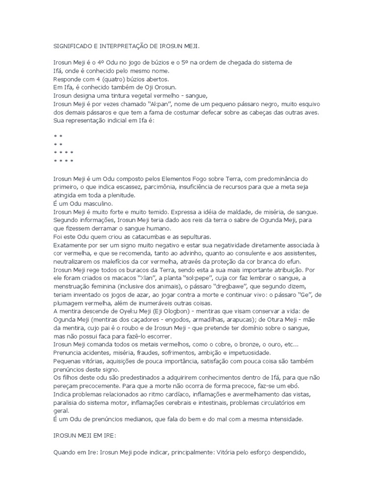 Irosun Meji um Odu composto pelos Elementos Fogo sobre Terra, com predominncia do primeiro, o que indica escassez, parcimnia, insuficincia de recursos para que a meta seja atingida em toda a plenitude. um Odu masculino. Irosun Meji muito forte e muito temido. Expressa a idia de maldade, de misria, de sangue. Segundo informaes, Irosun Meji teria dado aos reis da terra o sabre de Ogunda Meji, para que fizessem derramar o sangue humano. Foi este Odu quem criou as catacumbas e as sepulturas. Exatamente por ser um signo muito negativo e estar sua negatividade diretamente associada cor vermelha, e que se recomenda, tanto ao advinho, quanto ao consulente e aos assistentes, neutralizarem os malefcios da cor vermelha, atravs da proteo da cor branca do efun. Irosun Meji rege todos os buracos da Terra, sendo esta a sua mais importante atribuio. Por ele foram criados os macacos Xlan, a planta sokpepe, cuja cor faz lembrar o sangue, a menstruao feminina (inclusive dos animais), o pssaro dregbawe, que segundo dizem, teriam inventado os jogos de azar, ao jogar contra a morte e continuar vivo: o pssaro Ge, de plumagem vermelha, alm de inumerveis outras coisas. A mentira descende de Oyeku Meji (Eji Ologbon) - mentiras que visam conservar a vida: de Ogunda Meji (mentiras dos caadores - engodos, armadilhas, arapucas); de Otura Meji - me da mentira, cujo pai o roubo e de Irosun Meji - que pretende ter domnio sobre o sangue, mas no possui faca para faz-lo escorrer. Irosun Meji comanda todos os metais vermelhos, como o cobre, o bronze, o ouro, etc... Prenuncia acidentes, misria, fraudes, sofrimentos, ambio e impetuosidade. Pequenas vitrias, aquisies de pouca importncia, satisfao com pouca coisa so tambm prenncios deste signo. Os filhos deste odu so predestinados a adquirirem conhecimentos dentro de If, para que no peream precocemente. Para que a morte no ocorra de forma precoce, faz-se um eb. Indica problemas relacionados ao ritmo cardaco, inflamaes e avermelhamento das vistas, paralisia do sistema motor, inflamaes cerebrais e intestinais, problemas circulatrios em geral. um Odu de prenncios medianos, que fala do bem e do mal com a mesma intensidade. IROSUN MEJI EM IRE: Quando em Ire: Irosun Meji pode indicar, principalmente: Vitria pelo esforo despendido,