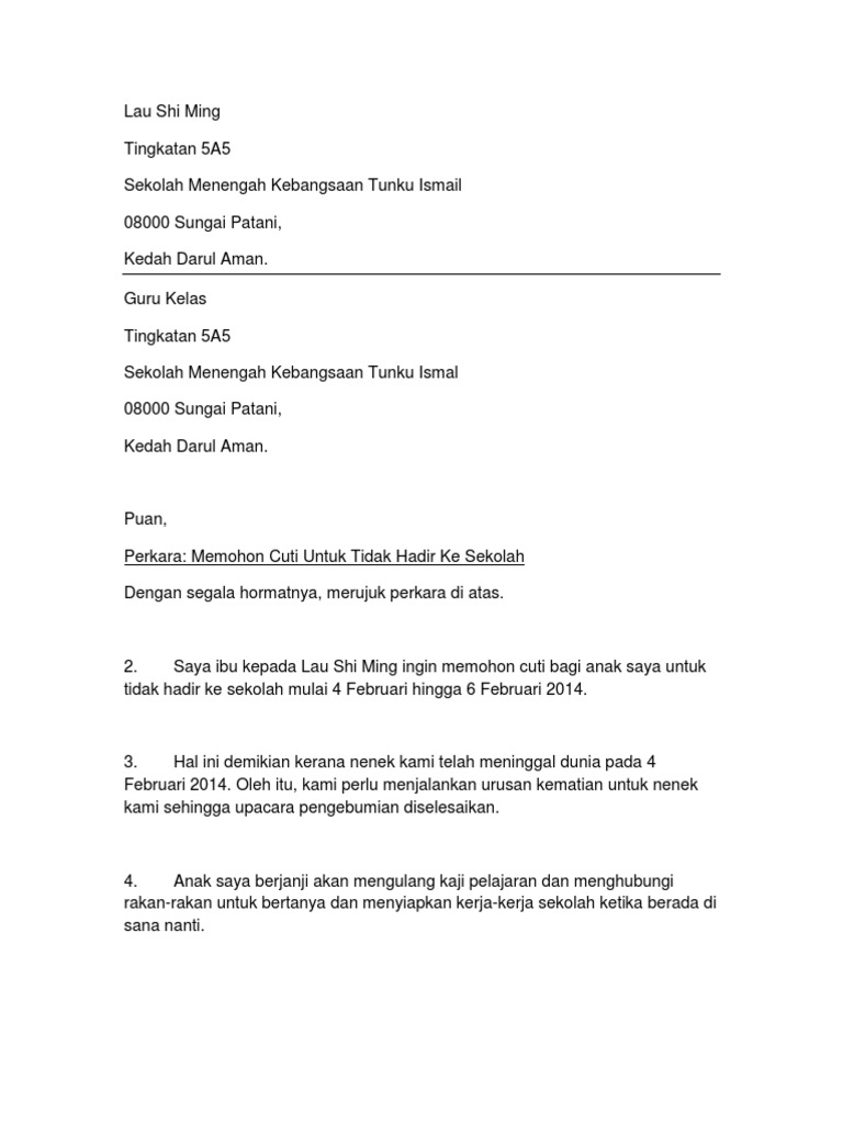 2. Saya ibu kepada Lau Shi Ming ingin memohon cuti bagi anak saya untuk tidak hadir ke sekolah mulai 4 Februari hingga 6 Februari 2014.