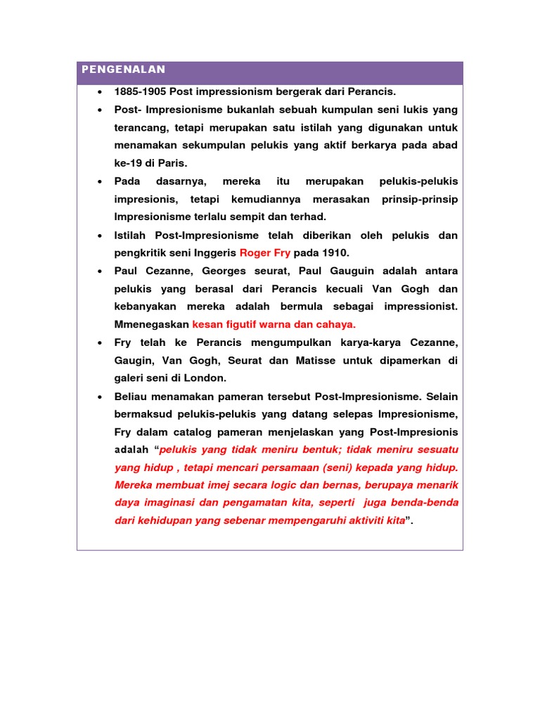 s. Post- Impresionisme bukanlah sebuah kumpulan seni lukis yang terancang, tetapi merupakan satu istilah yang digunakan untuk menamakan sekumpulan pelukis yang aktif berkarya pada abad ke-19 di Paris. Pada dasarnya, tetapi mereka itu merupakan merasakan pelukis-pelukis prinsip-prinsip