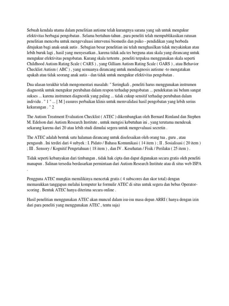 pengobatan . Selama bertahun-tahun , para peneliti telah mempublikasikan ratusan penelitian mencoba untuk mengevaluasi intervensi biomedis dan psiko - pendidikan yang berbeda ditujukan bagi anak-anak autis . Sebagian besar penelitian ini telah menghasilkan tidak meyakinkan atau lebih buruk lagi , hasil yang menyesatkan , karena tidak ada tes berguna atau skala yang dirancang untuk mengukur efektivitas pengobatan. Kurang skala tertentu , peneliti terpaksa menggunakan skala seperti Childhood Autism Rating Scale ( CARS ) , yang Gilliam Autism Rating Scale ( GARS ) , atau Behavior Checklist Autism ( ABC ) , yang semuanya dirancang untuk mendiagnosis autisme -to mengatakan apakah atau tidak seorang anak autis - dan tidak untuk mengukur efektivitas pengobatan . Dua ulasan terakhir telah mengomentari masalah: " Seringkali , peneliti harus menggunakan instrumen diagnostik untuk mengukur perubahan dalam respon terhadap pengobatan ... pendekatan ini belum sangat sukses ... karena instrumen diagnostik yang paling ... tidak cukup sensitif terhadap perubahan dalam individu . " 1 " ... [ M ] easures perbaikan klinis untuk memvalidasi hasil pengobatan yang lebih serius kekurangan . " 2 The Autism Treatment Evaluation Checklist ( ATEC ) dikembangkan oleh Bernard Rimland dan Stephen M. Edelson dari Autism Research Institute , untuk mengisi kebutuhan ini , yang terutama mendesak sekarang karena dari 20 atau lebih studi dimulai segera untuk mengevaluasi secretin . The ATEC adalah bentuk satu halaman dirancang untuk diselesaikan oleh orang tua , guru , atau pengasuh . Ini terdiri dari 4 subyek : I. Pidato / Bahasa Komunikasi ( 14 item ) ; II . Sosialisasi ( 20 item ) ; III . Sensory / Kognitif Pengetahuan ( 18 item ) , dan IV . Kesehatan / Fisik / Perilaku ( 25 item ) . Tidak seperti kebanyakan dari timbangan , tidak hak cipta dan dapat digunakan secara gratis oleh peneliti manapun . Salinan tersedia berdasarkan permintaan dari Autism Research Institute atau di situs web ISPA . Pengguna ATEC mungkin memilikinya mencetak gratis ( 4 subscores dan skor total) dengan memasukkan tanggapan melalui komputer ke formulir ATEC di situs untuk segera dan bebas Operatorscoring . Bentuk ATEC hanya diterima secara online . Hasil penelitian menggunakan ATEC akan muncul dalam isu-isu masa depan ARRI ( hanya dengan izin dari para peneliti yang menggunakan ATEC , tentu saja)