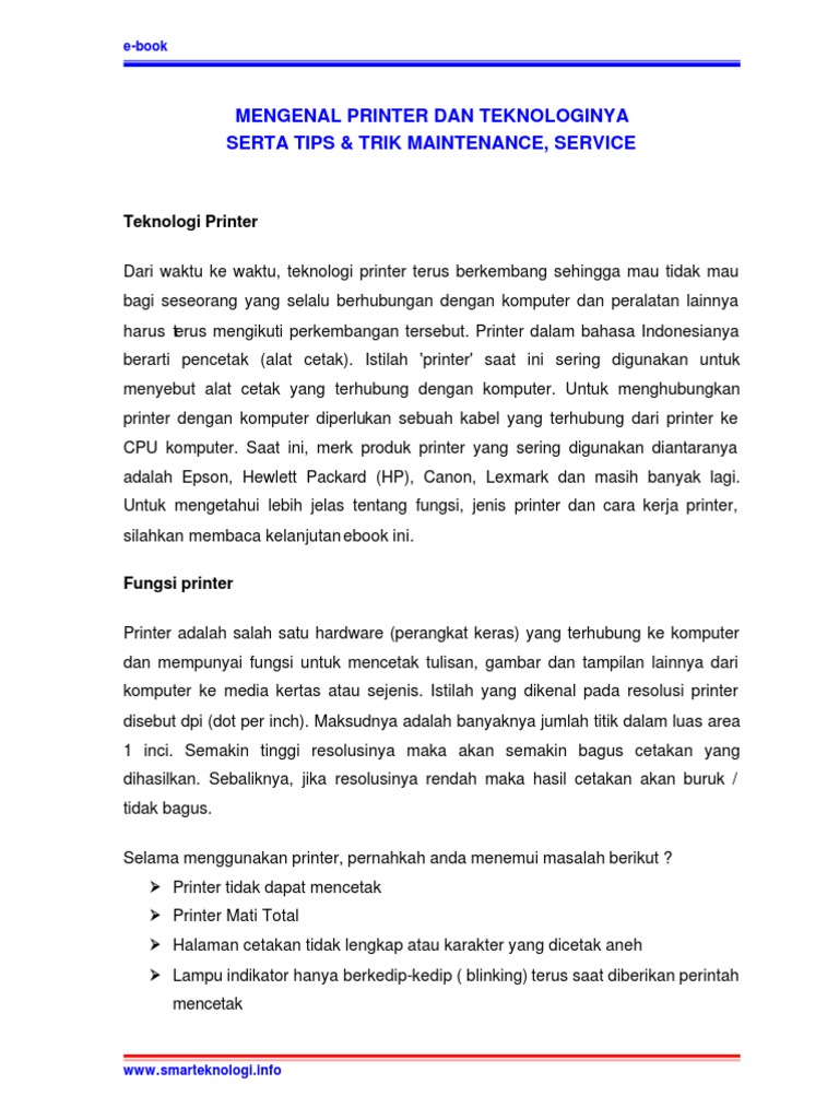 Teknologi Printer Dari waktu ke waktu, teknologi printer terus berkembang sehingga mau tidak mau bagi seseorang yang selalu berhubungan dengan komputer dan peralatan lainnya harus terus mengikuti perkembangan tersebut. Printer dalam bahasa Indonesianya berarti pencetak (alat cetak). Istilah 'printer' saat ini sering digunakan untuk menyebut alat cetak yang terhubung dengan komputer. Untuk menghubungkan printer dengan komputer diperlukan sebuah kabel yang terhubung dari printer ke CPU komputer. Saat ini, merk produk printer yang sering digunakan diantaranya adalah Epson, Hewlett Packard (HP), Canon, Lexmark dan masih banyak lagi. Untuk mengetahui lebih jelas tentang fungsi, jenis printer dan cara kerja printer, silahkan membaca kelanjutan ebook ini. Fungsi printer Printer adalah salah satu hardware (perangkat keras) yang terhubung ke komputer dan mempunyai fungsi untuk mencetak tulisan, gambar dan tampilan lainnya dari komputer ke media kertas atau sejenis. Istilah yang dikenal pada resolusi printer disebut dpi (dot per inch). Maksudnya adalah banyaknya jumlah titik dalam luas area 1 inci. Semakin tinggi resolusinya maka akan semakin bagus cetakan yang dihasilkan. Sebaliknya, jika resolusinya rendah maka hasil cetakan akan buruk / tidak bagus. Selama menggunakan printer, pernahkah anda menemui masalah berikut ? Printer tidak dapat mencetak Printer Mati Total Halaman cetakan tidak lengkap atau karakter yang dicetak aneh Lampu indikator hanya berkedip-kedip ( blinking) terus saat diberikan perintah mencetak